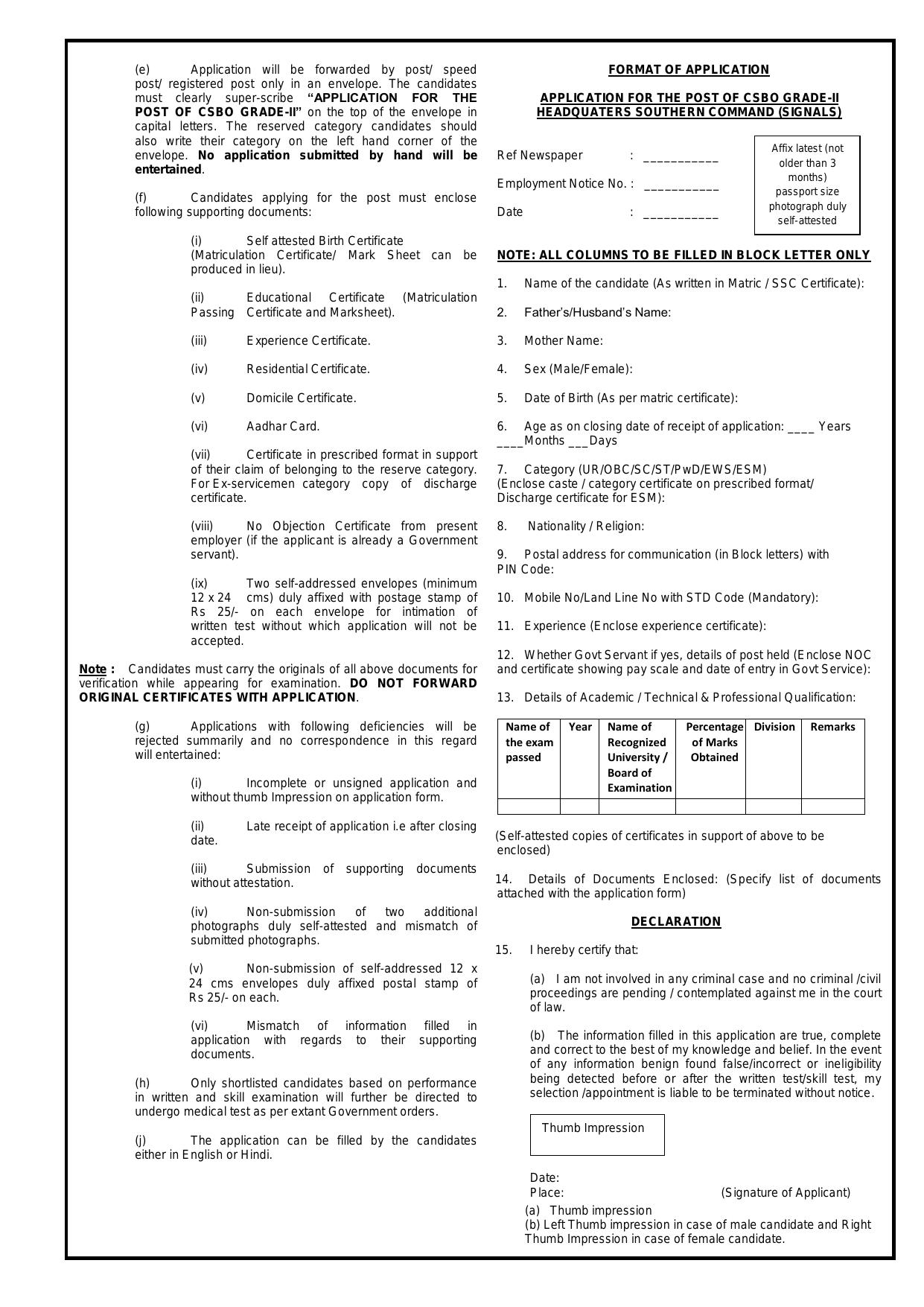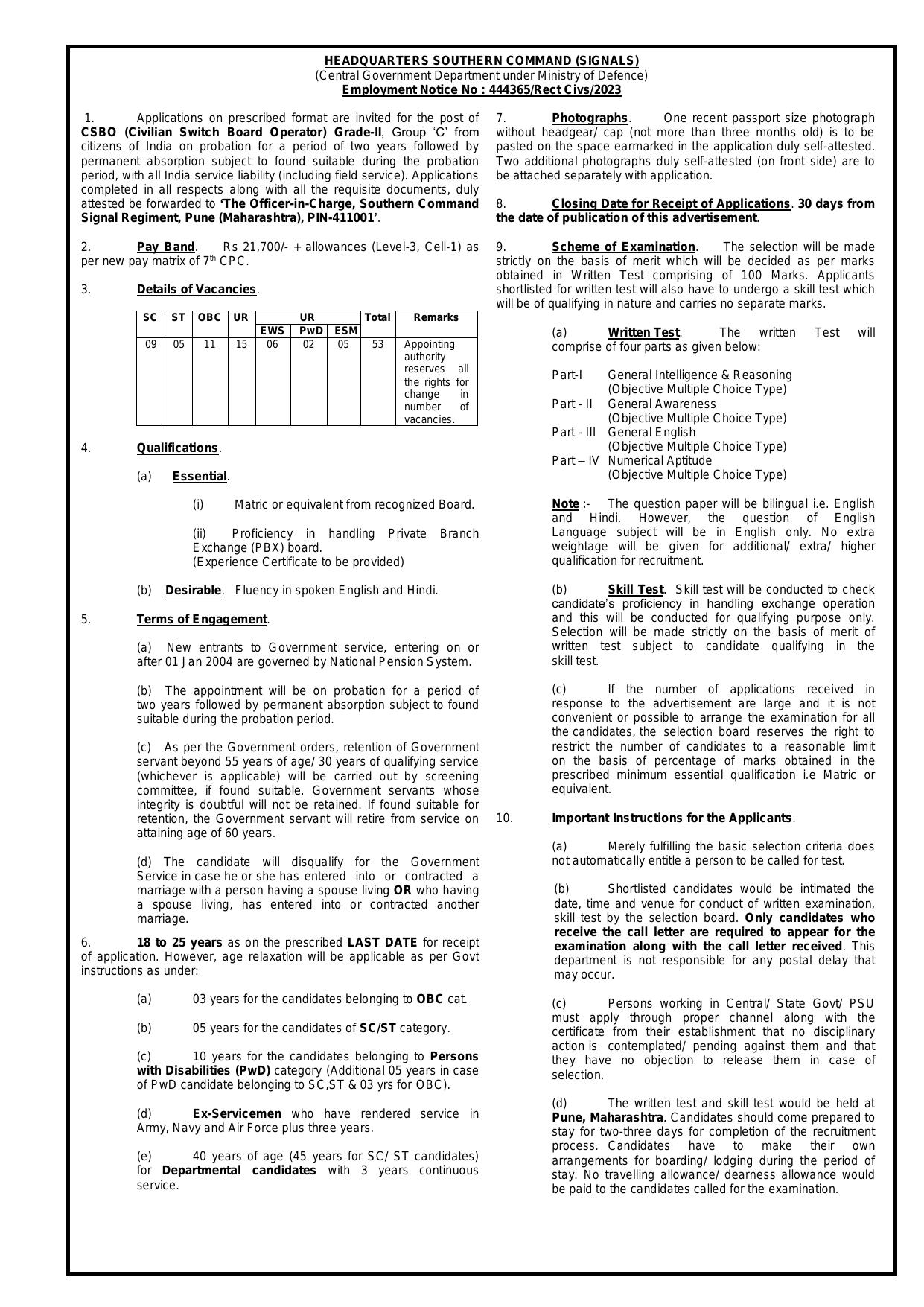 Army HQ Southern Command Civilian 53 Switch Board Operator (CSBO) Recruitment 2023