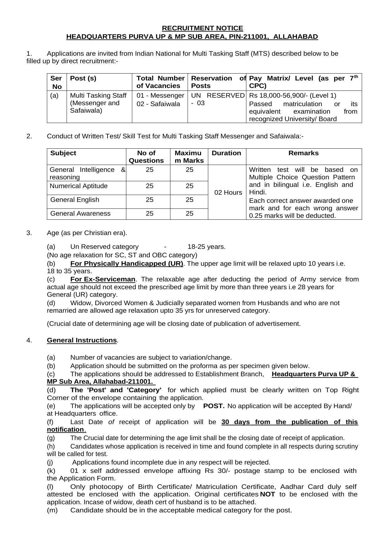 Headquarters Purva UP & MP Sub Area Messenger, Safaiwala Recruitment 2022