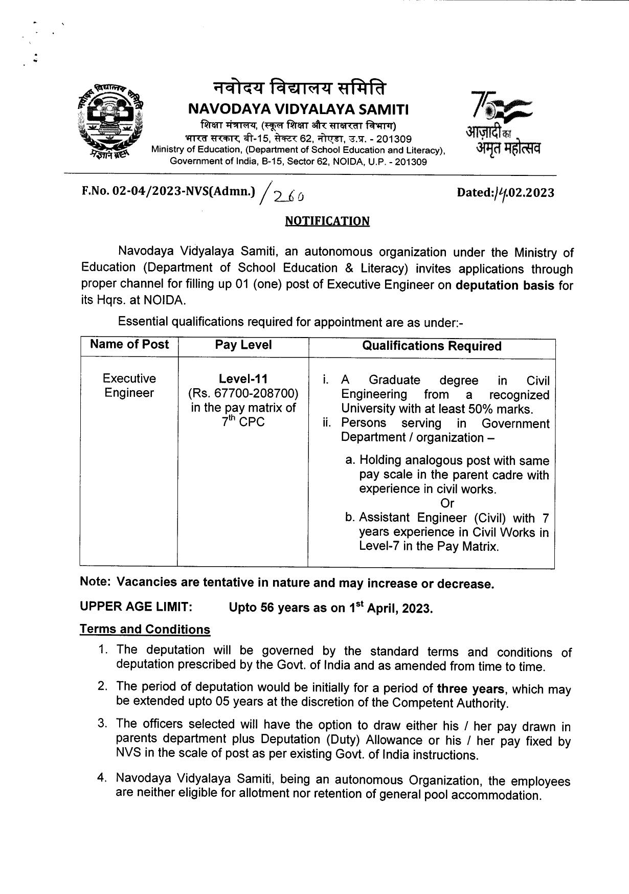 Navodaya Vidyalaya Samiti Noida Invites Application for Executive Engineer Recruitment 2023