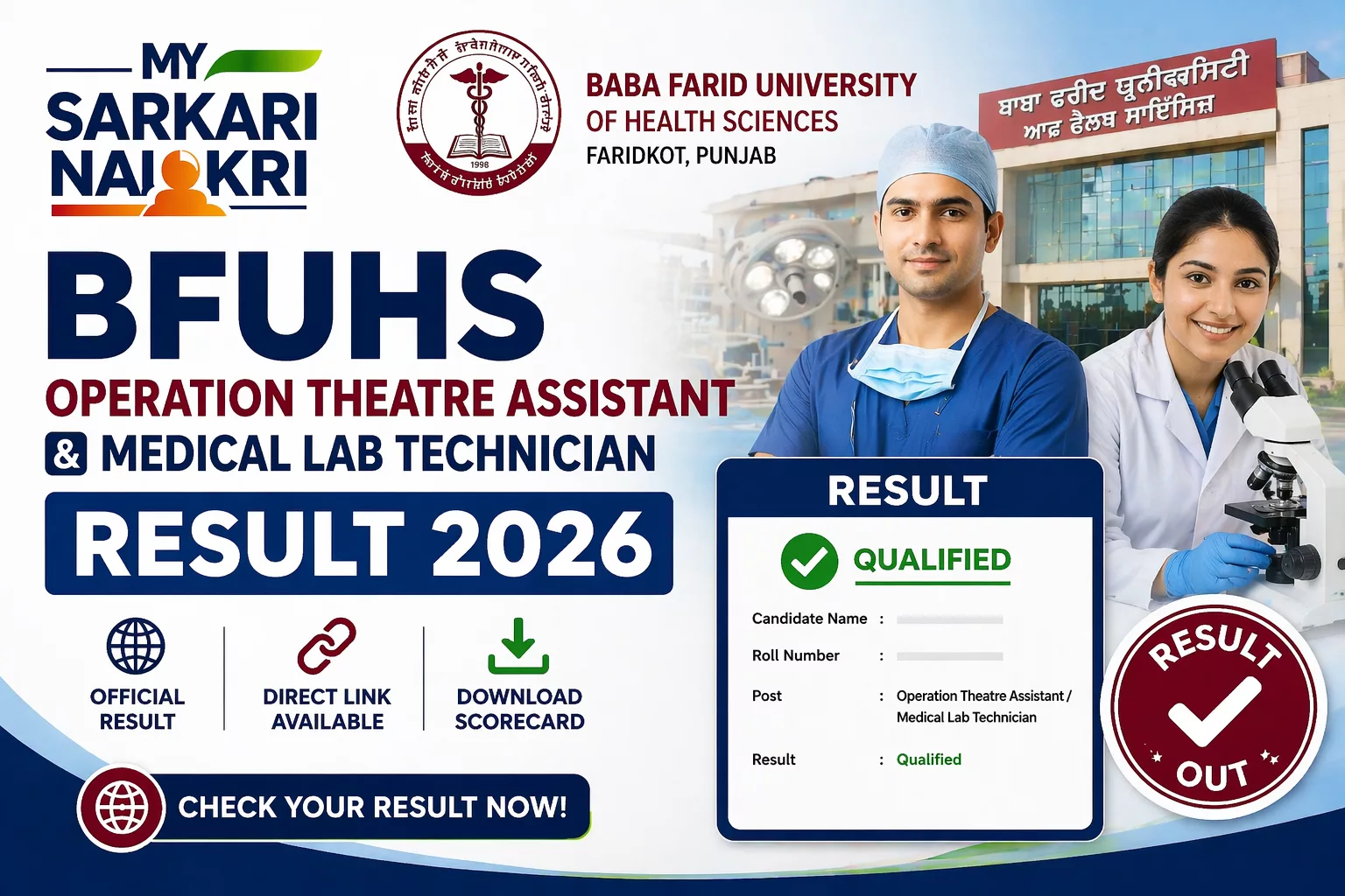 Baba Farid University of Health Sciences (BFUHS) has declared the BFUHS Operation Theatre Assistant and Medical Lab Technician Provisional Result 2026 on 15th April 2026. Candidates who appeared for the examination held on 07-04-2026 can now check their qualifying status and download the provisional result PDF from the official portal.