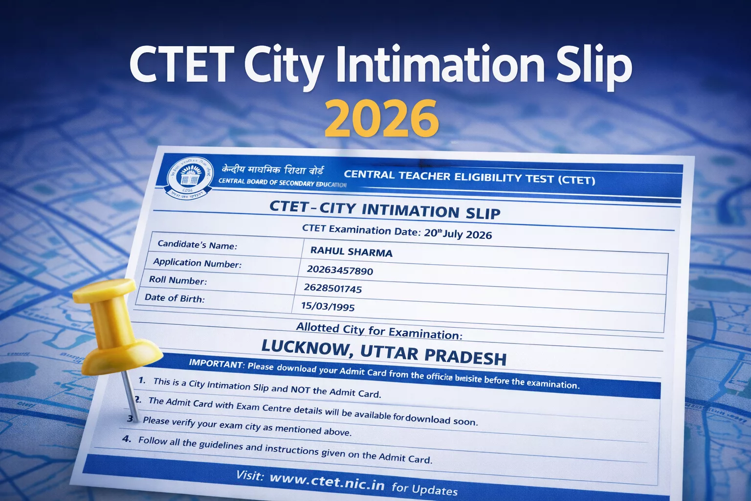 CTET City Intimation Slip 2026 has been released by Central Board of Secondary Education (CBSE) on 23 January 2026. Candidates who applied for the Central Teacher Eligibility Test (CTET) February 2026 can check and download their exam city intimation slip from the official website ctet.nic.in. The examination is scheduled for 08 February 2026 (in two shifts) across various cities in India.