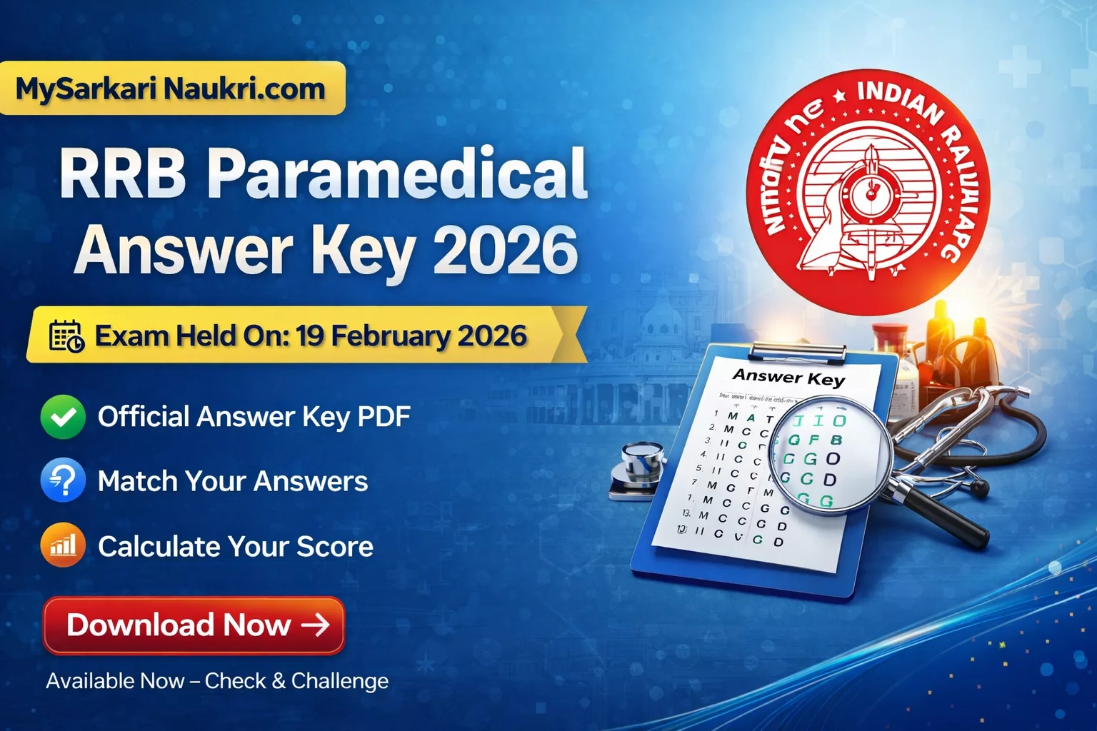 The Railway Recruitment Board (RRB) has released the Paramedical Answer Key 2026 (CEN 03/2025). Candidates who appeared for the Paramedical examination held on 11th to 13th March 2026 can now check and download the provisional answer key from the official website www.rrbcdg.gov.in (or respective regional RRB websites).