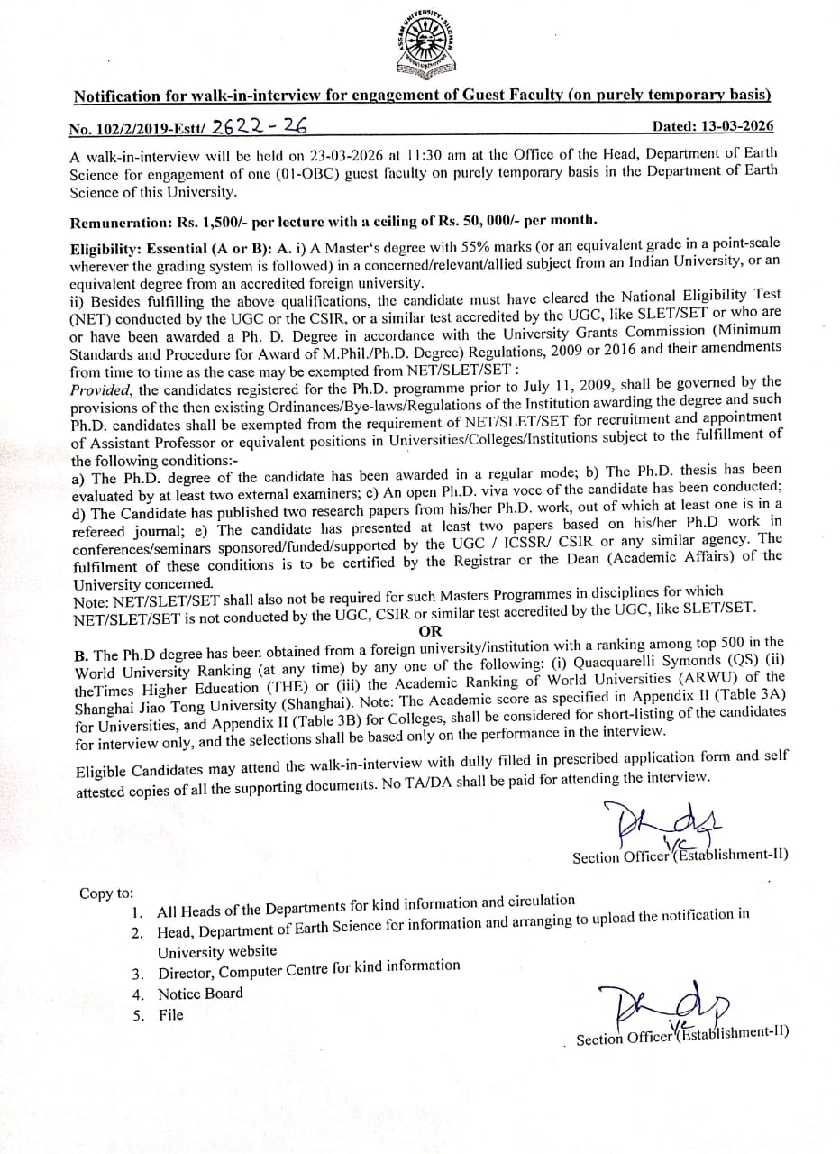 Assam University Recruitment 2026 for 1 Guest Faculty (Earth Science) – Apply Offline for Walk-in-Interview @ aus.ac.in