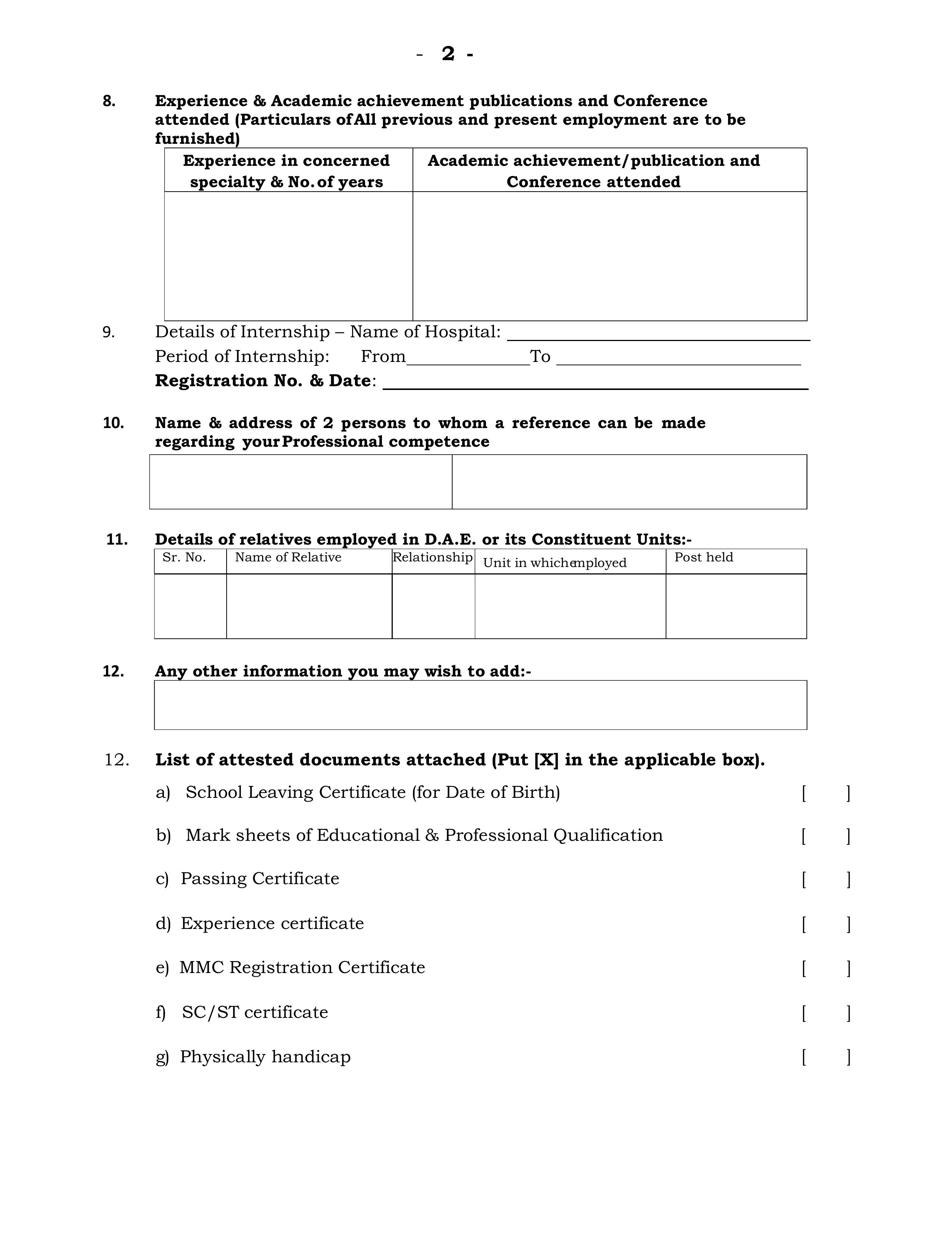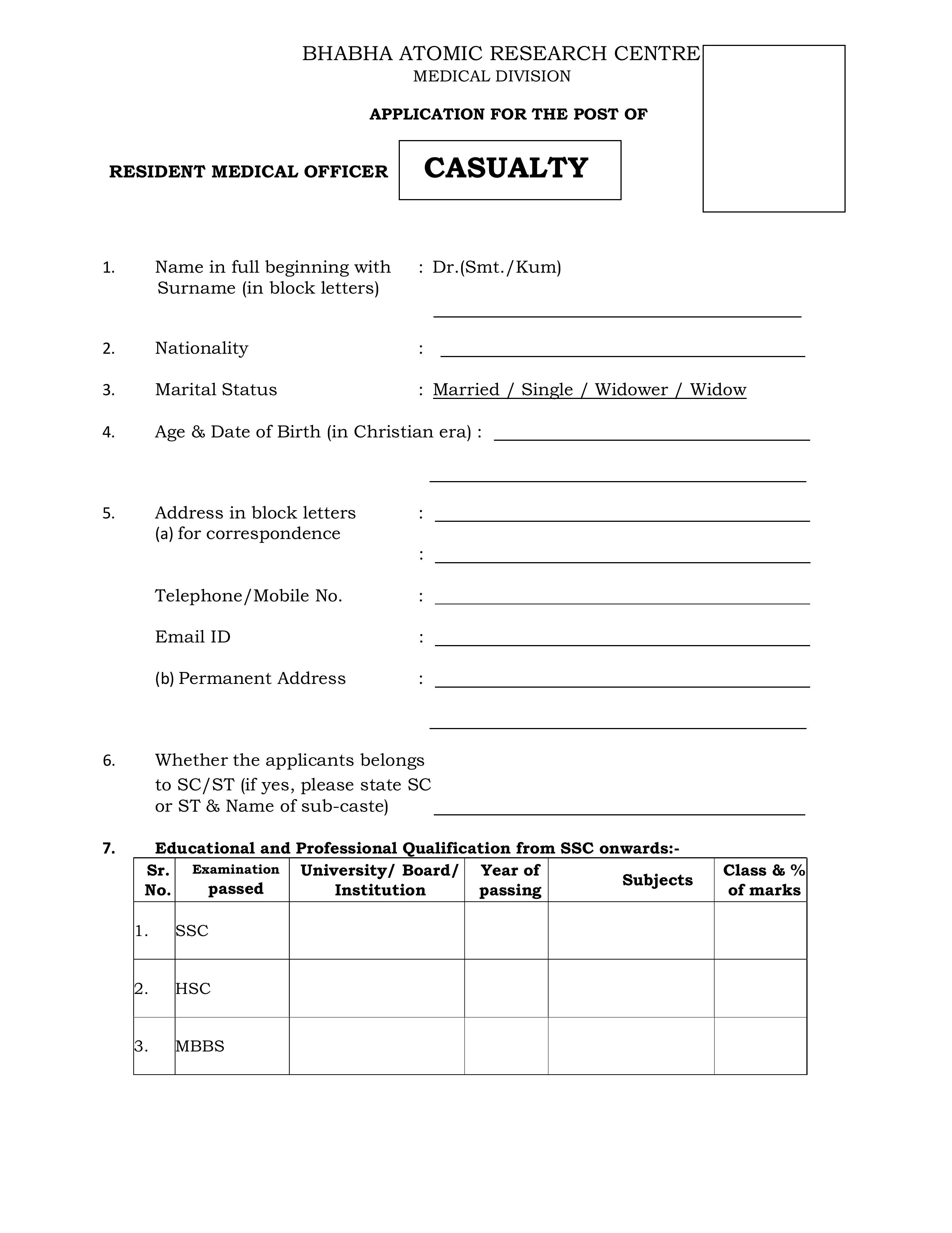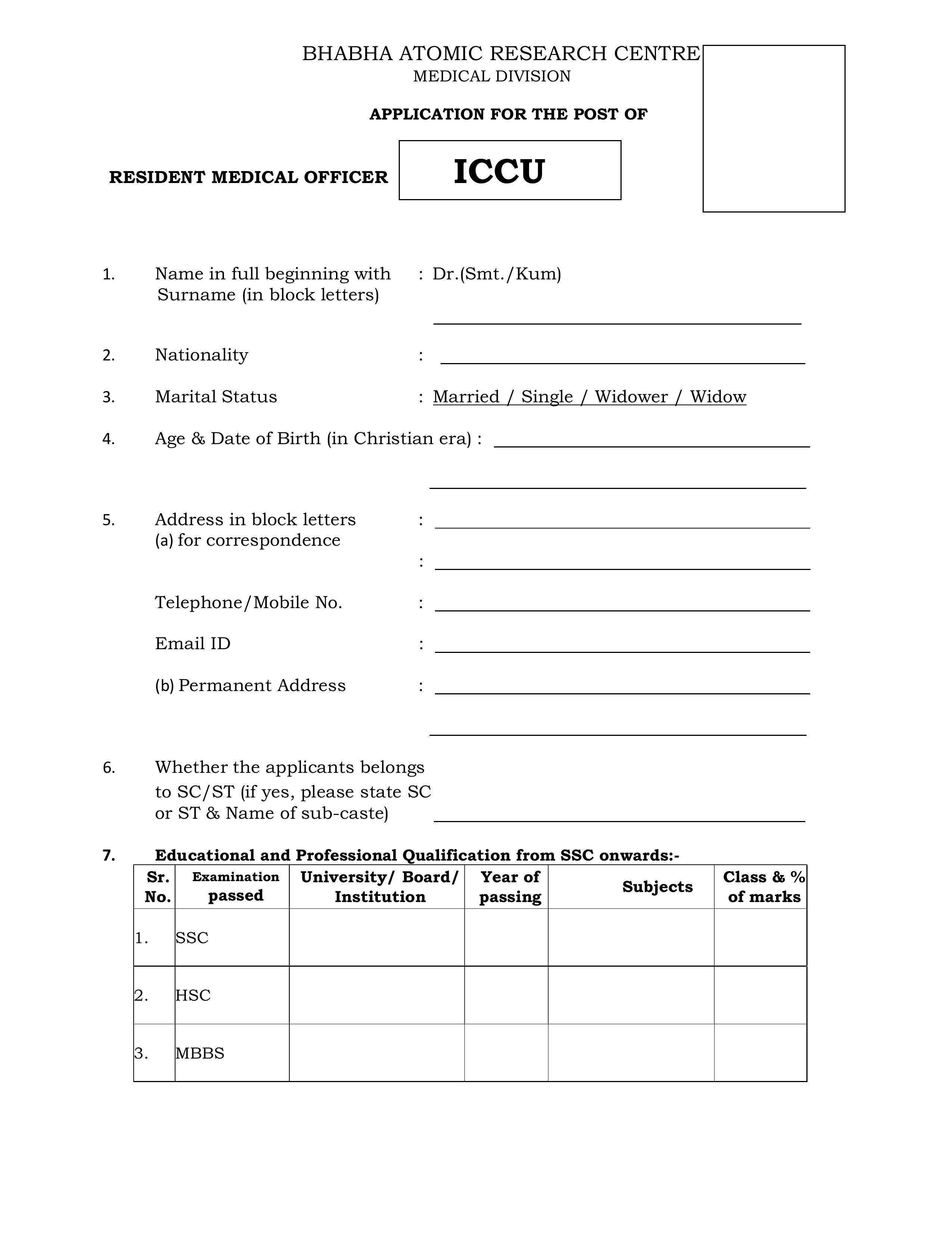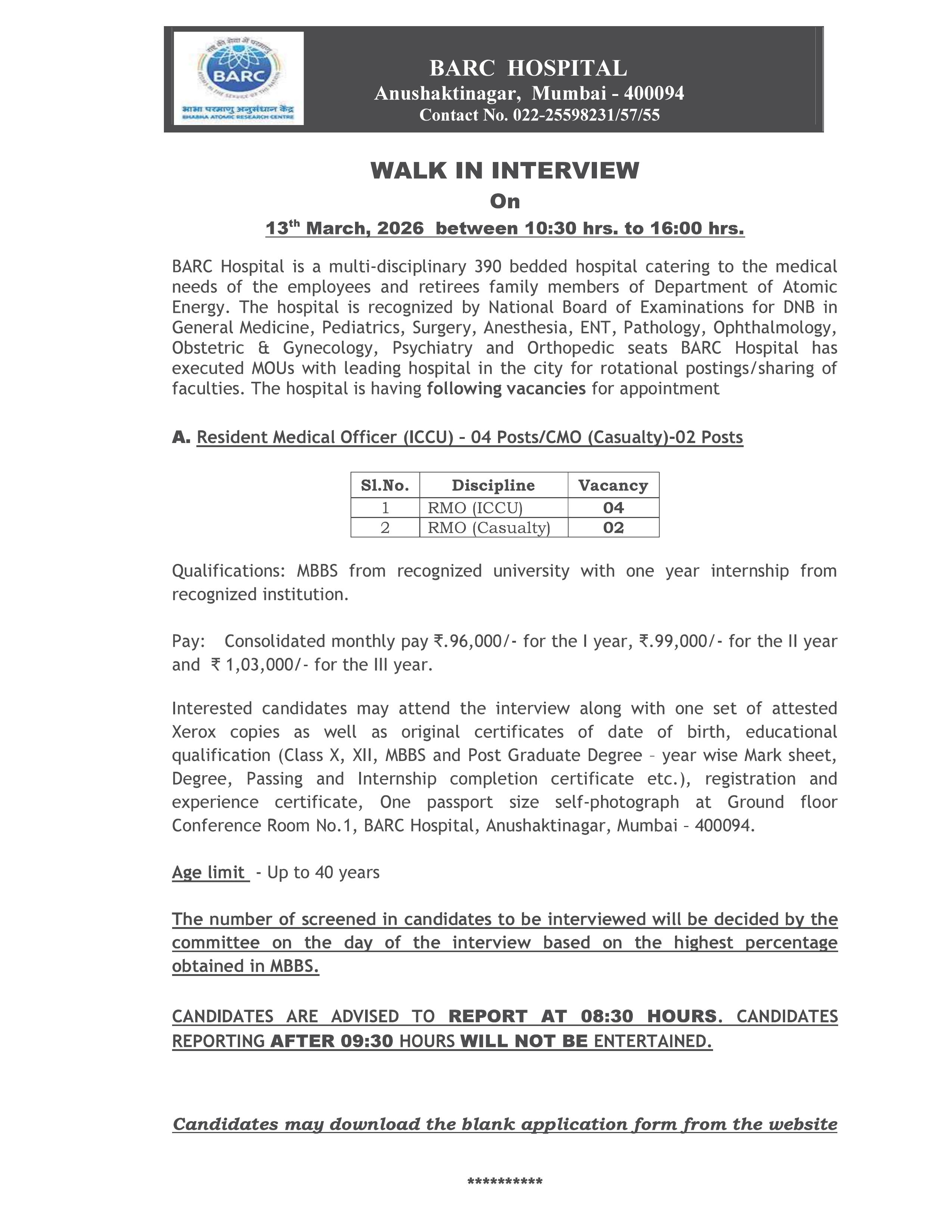 BARC HOSPITAL Anushaktinagar, Mumbai - 400094 Contact No. 022-25598231/57/55 WALK IN INTERVIEW On 13" March, 2026 between 10:30 hrs. to 16:00 hrs. BARC Hospital is a multi-disciplinary 390 bedded hospital catering to the medical needs of the employees and retirees family members of Department of Atomic Energy. The hospital is recognized by National Board of Examinations for DNB in General Medicine, Pediatrics, Surgery, Anesthesia, ENT, Pathology, Ophthalmology, Obstetric & Gynecology, Psychiatry and Orthopedic seats BARC Hospital has executed MOUs with leading hospital in the city for rotational postings/sharing of faculties. The hospital is having following vacancies for appointment A. Resident Medical Officer (ICCU) - 04 Posts/CMO (Casualty)-02 Posts | 81.00. | Discipline Vacancy 1 RMO (ICCU | 04 | 2 RMO (Casualty) | 02 | Qualifications: MBBS from recognized university with one year internship from recognized institution. Pay: Consolidated monthly pay =.96,000/- for the | year, =.99,000/- for the II year and 2% 1,03,000/- for the Ill year. Interested candidates may attend the interview along with one set of attested Xerox copies as well as original certificates of date of birth, educational qualification (Class X, XIl, MBBS and Post Graduate Degree - year wise Mark sheet, Degree, Passing and Internship completion certificate etc.), registration and experience certificate, One passport size self-photograph at Ground floor Conference Room No.1, BARC Hospital, Anushaktinagar, Mumbai - 400094. Age limit. - Up to 40 years The number of screened in candidates to be interviewed will be decided by the committee on the day of the interview based on the highest percentage obtained in MBBS. CANDIDATES ARE ADVISED TO REPORT AT 08:30 HOURS. CANDIDATES REPORTING AFTER 09:30 HOURS WILL NOT BE ENTERTAINED. Candidates may download the blank application form from the website REKKREREER RESIDENT MEDICAL OFFICER Name in full beginning with BHABHA ATOMIC RESEARCH CENTRE MEDICAL DIVISION APPLICATION FOR THE POST OF CASUALTY Surname (in block letters) 2. Nationality 3. Marital Status : Dr.(Smt./Kum) : Married / Single / Widower / Widow Age & Date of Birth (in Christian era) : Address in block letters (a) for correspondence Telephone/ Mobile No. Email ID (b) Permanent Address Whether the applicants belongs to SC/ST (if yes, please state SC or ST & Name of sub-caste) Educational and Professional Qualification from SSC onwards:- Se Examination No. passed University/ Board/ Institution Year of passing Subjects _| Class & % of marks 1. |SSC 2. |HSC B. MBBS 8. 10. 11. 12. 12. - 2- Experience & Academic achievement publications and Conference attended (Particulars ofAll previous and present employment are to be furnished Experience in concerned Academic achievement/ publication and specialty & No.of years Conference attended Details of Internship — Name of Hospital: Period of Internship: From To Registration No. & Date: Name & address of 2 persons to whom a reference can be made regarding your Professional competence Details of relatives employed in D.A.E. or its Constituent Units:- Sr. No. Name of Relative Relationship] [it in which anployed Post held eee ना ता | other information you may wish to add:- List of attested documents attached (Put [X] in the applicable box). a) School Leaving Certificate (for Date of Birth) b) Mark sheets of Educational & Professional Qualification c) Passing Certificate d) Experience certificate e) MMC Registration Certificate f) SC/ST certificate g) Physically handicap RESIDENT MEDICAL OFFICER Name in full beginning with BHABHA ATOMIC RESEARCH CENTRE MEDICAL DIVISION APPLICATION FOR THE POST OF ICCU Surname (in block letters) 2. Nationality 3. Marital Status : Dr.(Smt./Kum) : Married / Single / Widower / Widow Age & Date of Birth (in Christian era) : Address in block letters (a) for correspondence Telephone / Mobile No. Email ID (b) Permanent Address Whether the applicants belongs to SC/ST (if yes, please state SC or ST & Name of sub-caste) Educational and Professional Qualification from SSC onwards:- Se Examination No. passed University/ Board/ Institution Year of passing Subjects Class & % of marks 1. 550 2. |HSC B. |MBBS 8. 10. 11. 12. 12. - 2- Experience & Academic achievement publications and Conference attended (Particulars ofAll previous and present employment are to be furnished Experience in concerned Academic achievement/ publication and specialty & No.of years Conference attended Details of Internship — Name of Hospital: Period of Internship: From To Registration No. & Date: Name & address of 2 persons to whom a reference can be made regarding your Professional competence Details of relatives employed in D.A.E. or its Constituent Units:- Sr. No. Name of Relative Relationship] [it in which anployed Post held eee ना ता | other information you may wish to add:- List of attested documents attached (Put [X] in the applicable box). a) School Leaving Certificate (for Date of Birth) b) Mark sheets of Educational & Professional Qualification c) Passing Certificate d) Experience certificate e) MMC Registration Certificate f) SC/ST certificate g) Physically handicap