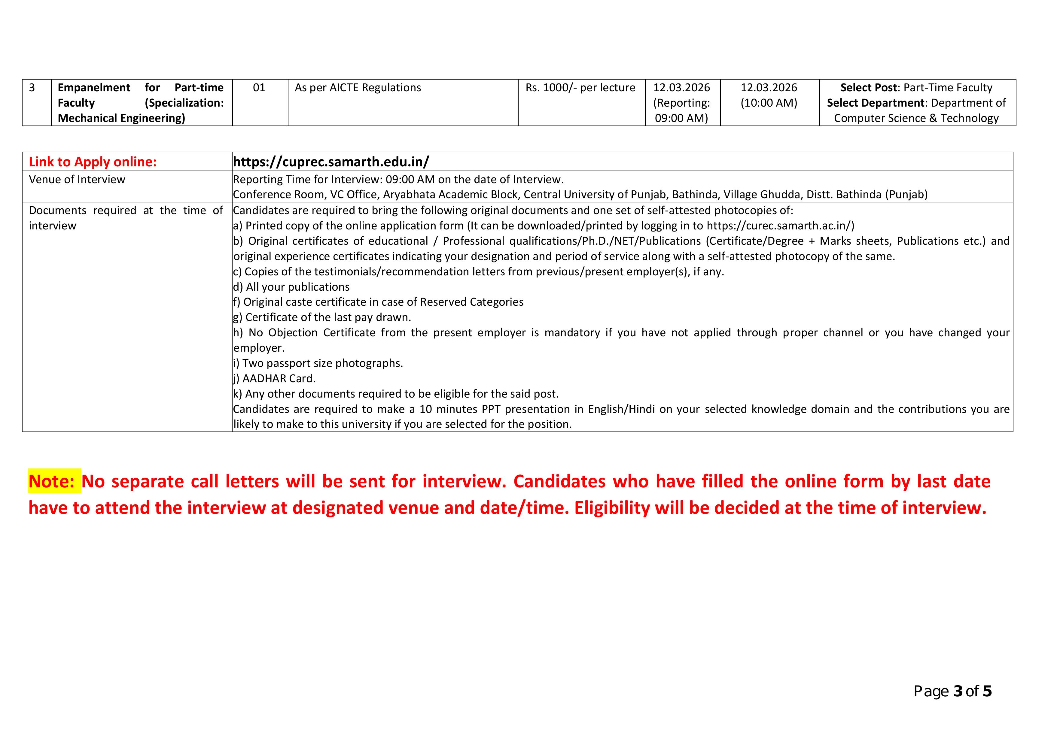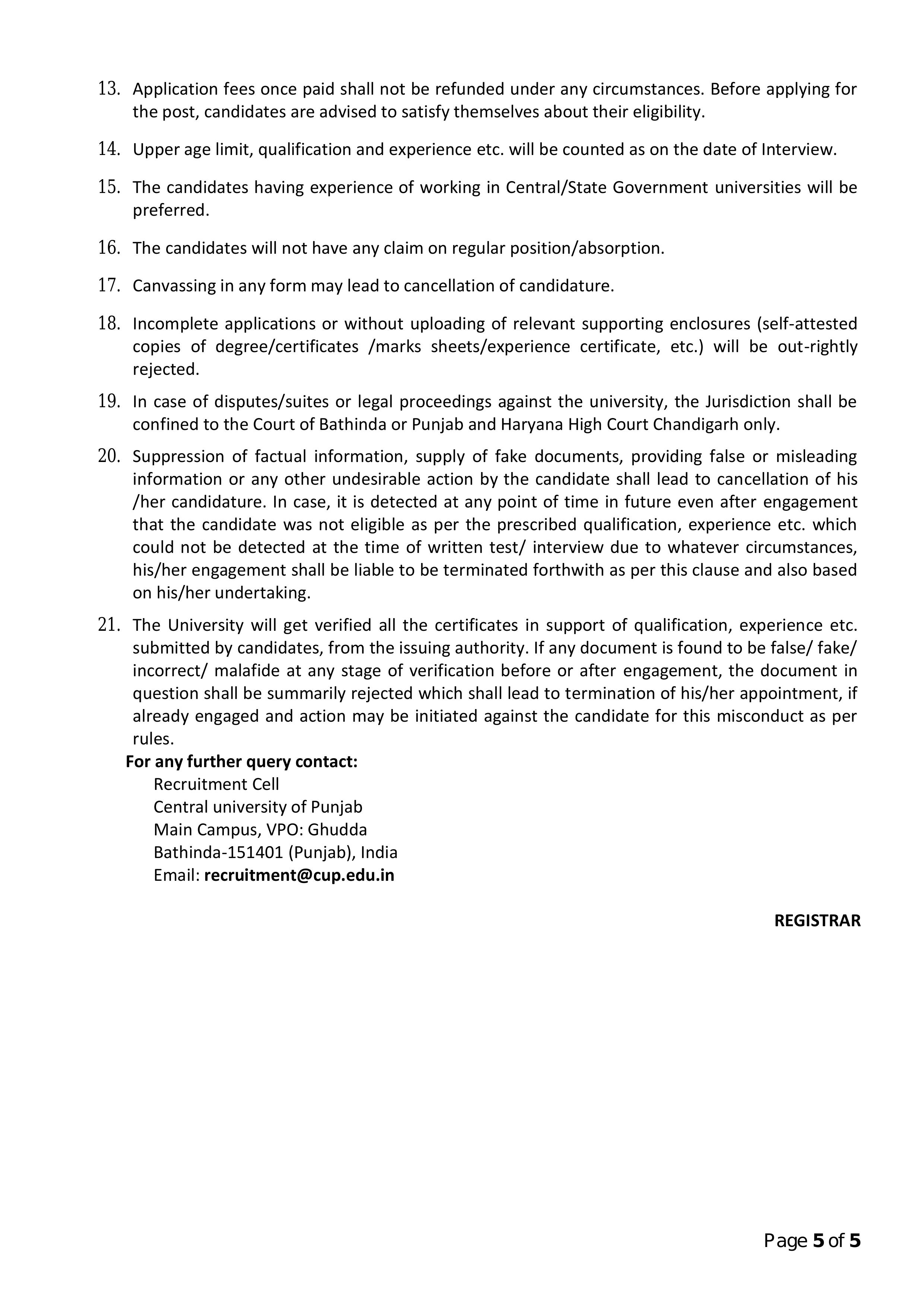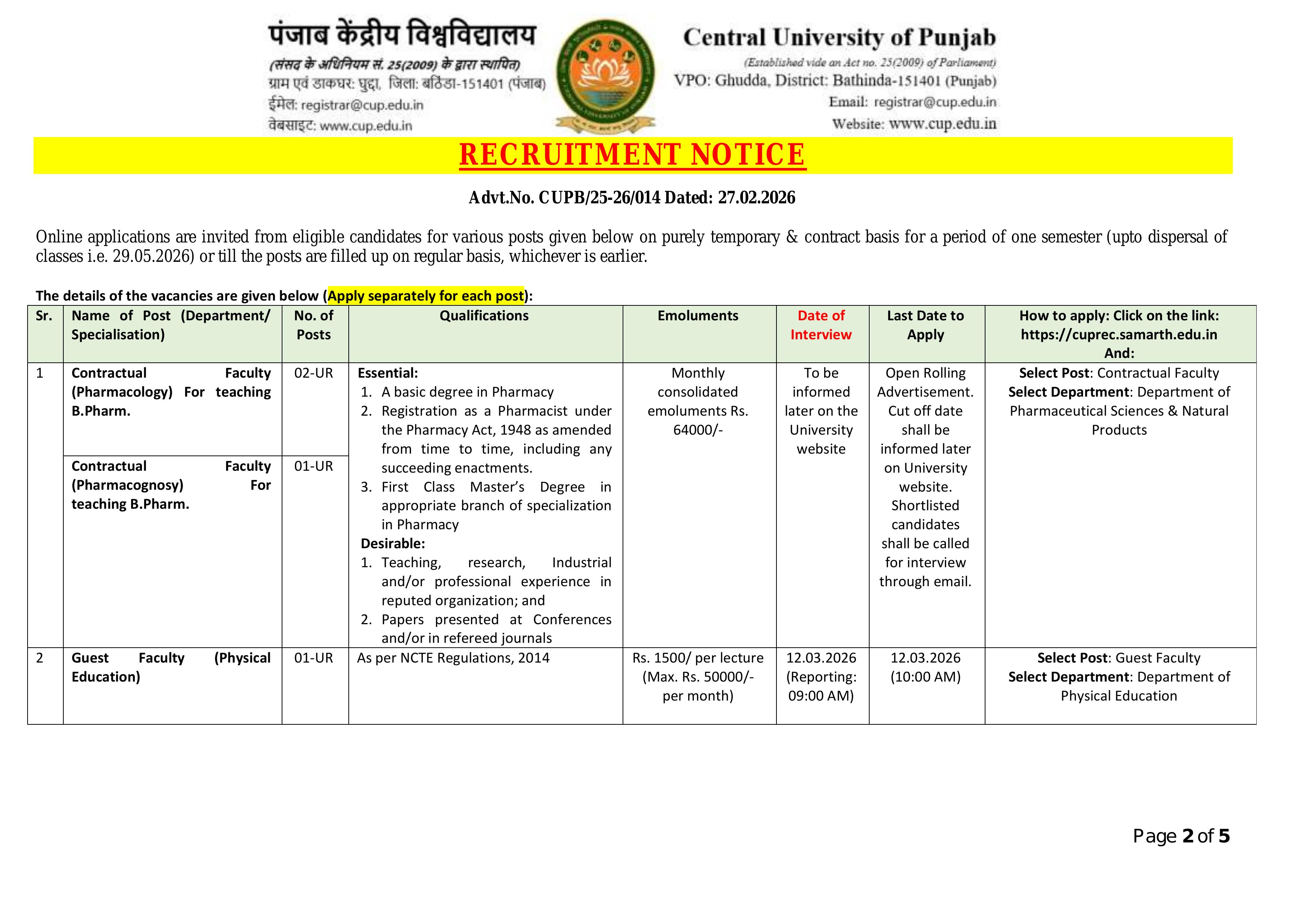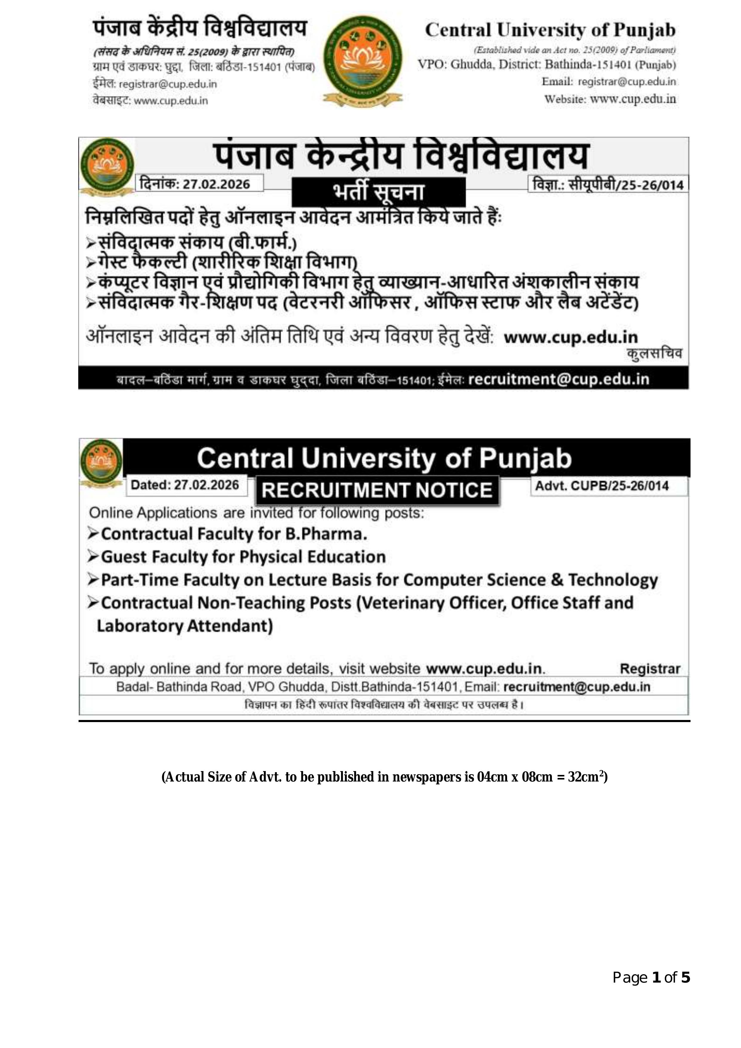 पंजाब केंद्रीय विश्वविद्यालय (संसद के अधिनियम स॑ 25/2009)] के द्वारा स्थापित) ग्राम एवं डाकघर: घुद्दा, जिला: बठिंडा-151401 (पंजाब) ईमेल: [email protected] Central University of Punjab (Established vide an Act no. 23/2009) af Parliament) VPO: Ghudda, District: Bathinda-151401 (Punjab) Email: [email protected] aqaISe: www.cup.edu.in Website: www.cup.edu.in पंजाब केन्द्रीय विश्वविद्यालय् | दिनांक: 27.02.2026 | _ xt | | विज्ञा: सीयूपीबी/25-26/014 निम्नलिखित पदों हेतु ऑनलाइन जाते हैं: > payee piers Gy TH.) rine शिक्षा >कंप्यूटर विज्ञान eas विभाग दल व्यास व्याख्यान-आधारित अंशकालीन संकाय >संविदात्मक गैर-शिक्षण पद (वेटरनरी , ऑफिस स्टाफ और लैब अटेंडेंट) ऑनलाइन आवेदन की अंतिम तिथि ud sa faarur eq Ged: www.cup.edu.in ne porated बादल-बठिंडा मार्ग, ग्राम व डाकघर घुद्दा, जिला बठिंडा-151401; ईमेल: ॥९८/७४(४॥11211(0८७.0.९७७.1॥॥ Central University of Punjab Dated: 27.02.2026 | | RECRUITMENT NOTICE | Advt. CUPB/25-26/014 Online Applications are invited for following posts: » Contractual Faculty for B.Pharma. » Guest Faculty for Physical Education » Part-Time Faculty on Lecture Basis for Computer Science & Technology » Contractual Non-Teaching Posts (Veterinary Officer, Office Staff and Laboratory Attendant) To apply online and for more details, visit website www.cup.edu.in. Registrar Badal- Bathinda Road, VPO Ghudda, Distt. Bathinda-151401, Email: [email protected] विज्ञापन का हिंदी रूपातर विश्वविद्यालय की वेबसाइट पर उपलब्ध है। (Actual Size of Advt. to be published in newspapers is 04cm x 08cm = 32cm2) Page lof 5