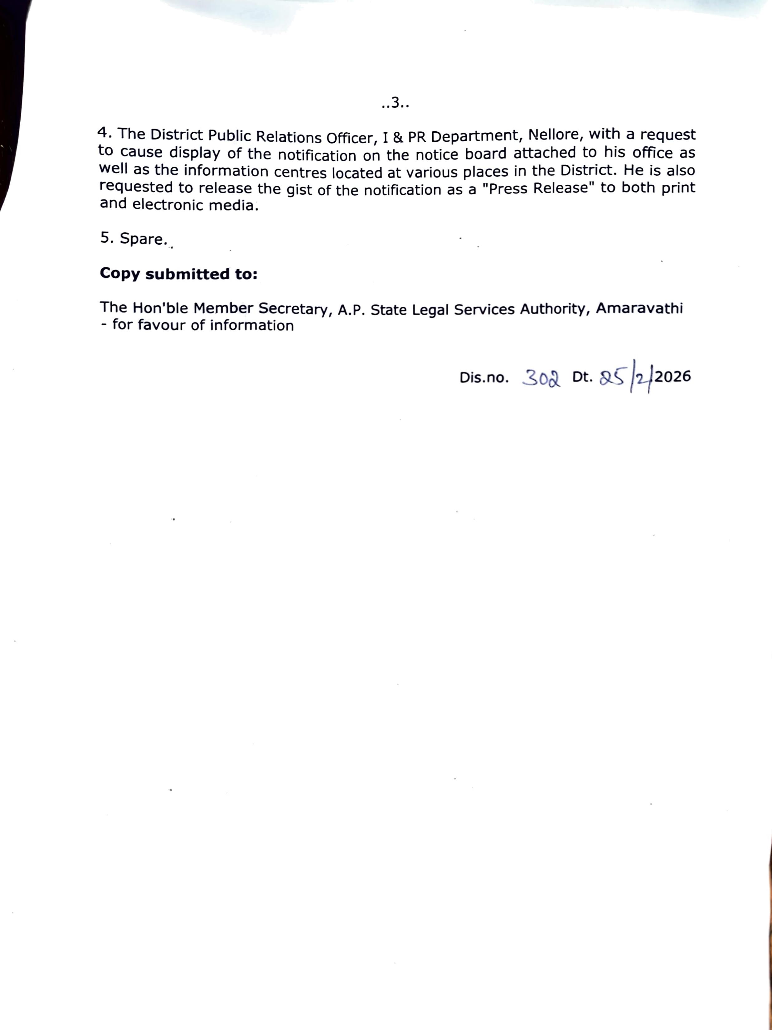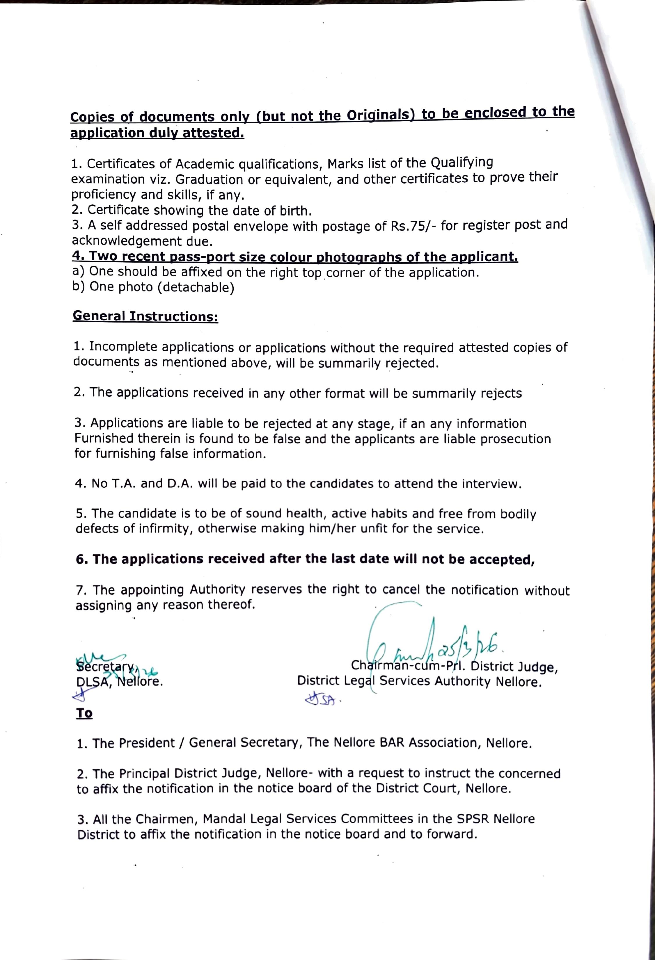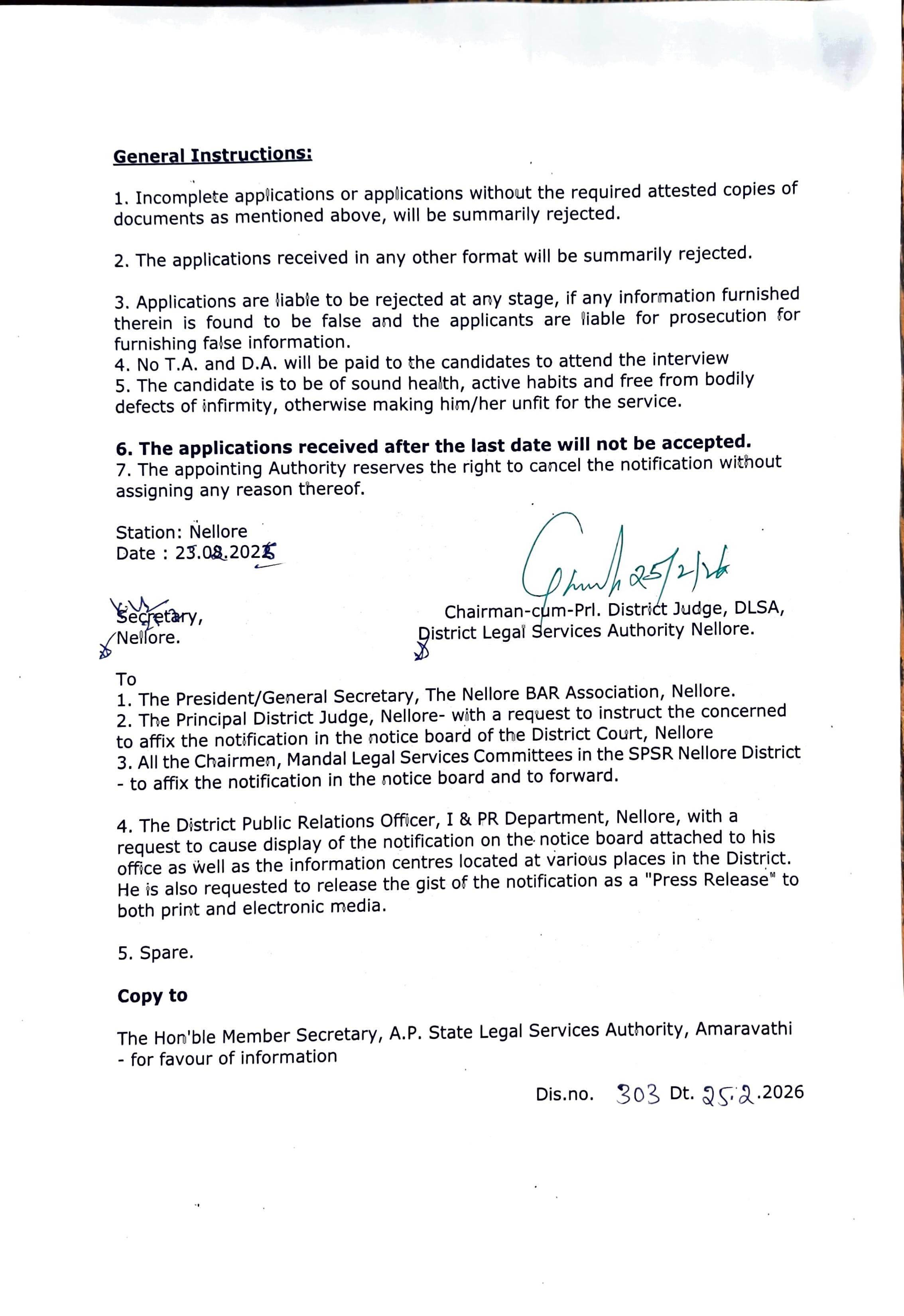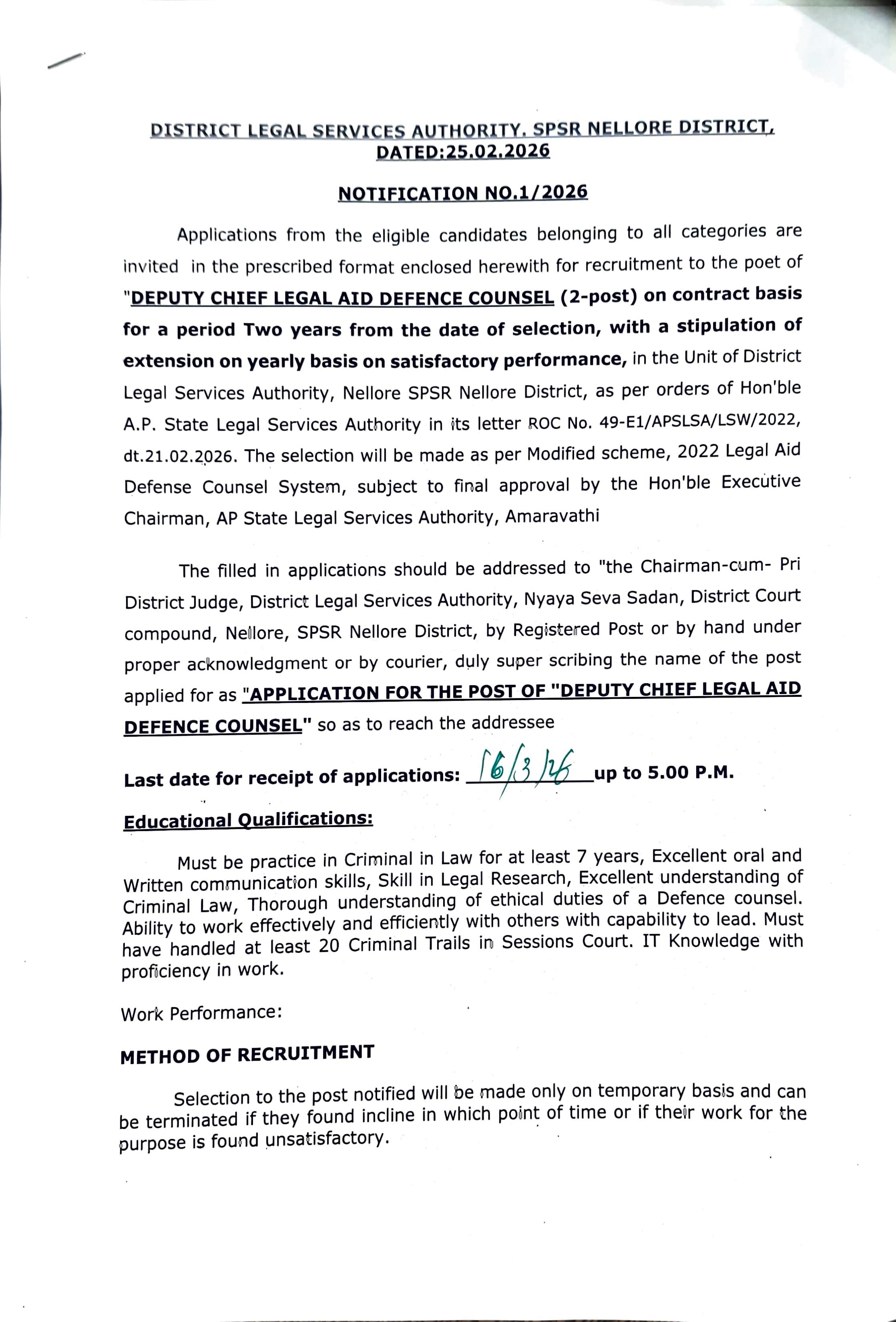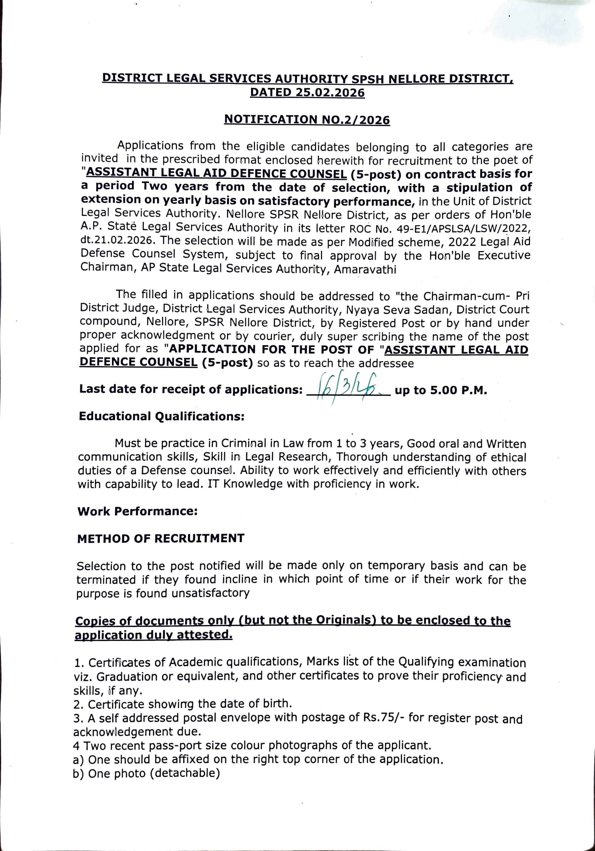 DISTRICT LEGAL SERVICES AUTHORITY, SPSR NELLORE DISTRICT, DATED:25.02.2026 NOTIFICATION NO.1/2026 Applications from the eligible candidates belonging to all categories are invited in the prescribed format enclosed herewith for recruitment to the poet of "DEPUTY CHIEF LEGAL AID DEFENCE COUNSEL (2-post) on contract basis for a period Two years from the date of selection, with a stipulation of extension on yearly basis on satisfactory performance, in the Unit of District Legal Services Authority, Nellore SPSR Nellore District, as per orders of Hon'ble A.P. State Legal Services Authority in its letter ROC No. 49-E1/APSLSA/LSW/2022, dt.21.02.2026. The selection will be made as per Modified scheme, 2022 Legal Aid Defense Counsel System, subject to final approval by the Hon'ble Executive Chairman, AP State Legal Services Authority, Amaravathi The filled in applications should be addressed to "the Chairman-cum- Pri District Judge, District Legal Services Authority, Nyaya Seva Sadan, District Court compound, Nellore, SPSR Nellore District, by Registered Post or by hand under proper acknowledgment or by courier, duly super scribing the name of the post applied for as "APPLICATION FOR THE POST OF "DEPUTY CHIEF LEGAL ALD THE POST OF "DEPUTY CHIEF LEGAL AID DEFENCE COUNSEL" so as to reach the addressee Last date for receipt of applications: S65 We 3 lp up to 5.00 P.M. Educational Qualifications: ualifications: Must be practice in Criminal in Law for at least 7 years, Excellent oral and Written communication skills, Skill in Legal Research, Excellent understanding of Criminal Law, Thorough understanding of ethical duties of a Defence counsel. Ability to work effectively and efficiently with others with capability to lead. Must have handled at least 20 Criminal Trails in Sessions Court. IT Knowledge with proficiency in work. Work Performance: METHOD OF RECRUITMENT Selection to the post notified will be made only on temporary basis and can be terminated if they found incline in which point of time or if their work for the purpose is found unsatisfactory. Copies of documents only (but not the Originals) to be enclosed to the ies of documents only (but not the Originals) to be enclosed to the application duly attested. 1. Certificates of Academic qualifications, Marks list of the Qualifying examination viz. Graduation or equivalent, and other certificates to prove their proficiency and skills, if any 2. Certificate showing the date of birth. 3. A self addressed postal envelope with postage of Rs.75/- for register post and acknowledgement due. 4. Two recent pass-port size colour photographs of the applicant. a) One should be affixed on the right top corner of the application. b) One photo (detachable) General Instructions: 1. Incomplete applications or applications without the required attested copies of documents as mentioned above, will be summarily rejected. 2. The applications received in any other format will be summarily rejects 3. Applications are liable to be rejected at any stage, if an any information Furnished therein is found to be false and the applicants are liable prosecution for furnishing false information. 4. No T.A. and D.A. will be paid to the candidates to attend the interview. 5. The candidate is to be of sound health, active habits and free from bodily defects of infirmity, otherwise making him/her unfit for the service. 6. The applications received after the last date will not be accepted, 7. The appointing Authority reserves the right to cancel the notification without assigning any reason thereof nn i asf pb. Ch Mbit Jaf District Judge, BISA NS ore District Legal Services Authority Nellore. A 1. The President / General Secretary, The Nellore BAR Association, Nellore. 2. The Principal District Judge, Nellore- with a request to instruct the concerned to affix the notification in the notice board of the District Court, Nellore. 3. All the Chairmen, Mandal Legal Services Committees in the SPSR Nellore District to affix the notification in the notice board and to forward. 7 ee 4. The District Public Relations Officer, I & PR Department, Nellore, with a request to cause display of the notification on the notice board attached to his office as Well as the information centres located at various places in the District. He is also requested to release the gist of the notification as a "Press Release" to both print and electronic media. 5. Spare. Copy submitted to: The Hon'ble Member Secretary, A.P. State Legal Services Authority, Amaravathi - for favour of information Dis.no. 209 Dt. AS |2|2026 DISTRICT LEGAL SERVICES AUTHORITY SPSH NELLORE DISTRICT, DATED 25.02.2026 NOTIFICATION NO.2/2026 Applications from the eligible candidates belonging to all categories are invited in the prescribed format enclosed herewith for recruitment to the poet of “ASSISTANT LEGAL AID DEFENCE ASSISTANT LEGAL AID DEFENCE COUNSEL (5-post) on contract basis for a period Two years from the date of selection, with a stipulation of extension on yearly basis on satisfactory performance, in the Unit of District Legal Services Authority. Nellore SPSR Nellore District, as per orders of Hon'ble A.P. State Legal Services Authority in its letter ROC No. 49-E1/APSLSA/LSW/2022, dt.21.02.2026. The selection will be made as per Modified scheme, 2022 Legal Aid Defense Counsel System, subject to final approval by the Hon'ble Executive Chairman, AP State Legal Services Authority, Amaravathi The filled in applications should be addressed to "the Chairman-cum- Pri District Judge, District Legal Services Authority, Nyaya Seva Sadan, District Court compound, Nellore, SPSR Nellore District, by Registered Post or by hand under proper acknowledgment or by courier, duly super scribing the name of the post applied for as "APPLICATION FOR THE POST OF "ASSISTANT LEGAL AID DEFENCE COUNSEL (5-post) so as to reach the addressee Last date for receipt of applications: Se phb up to 5.00 P.M. Educational Qualifications: Must be practice in Crimina