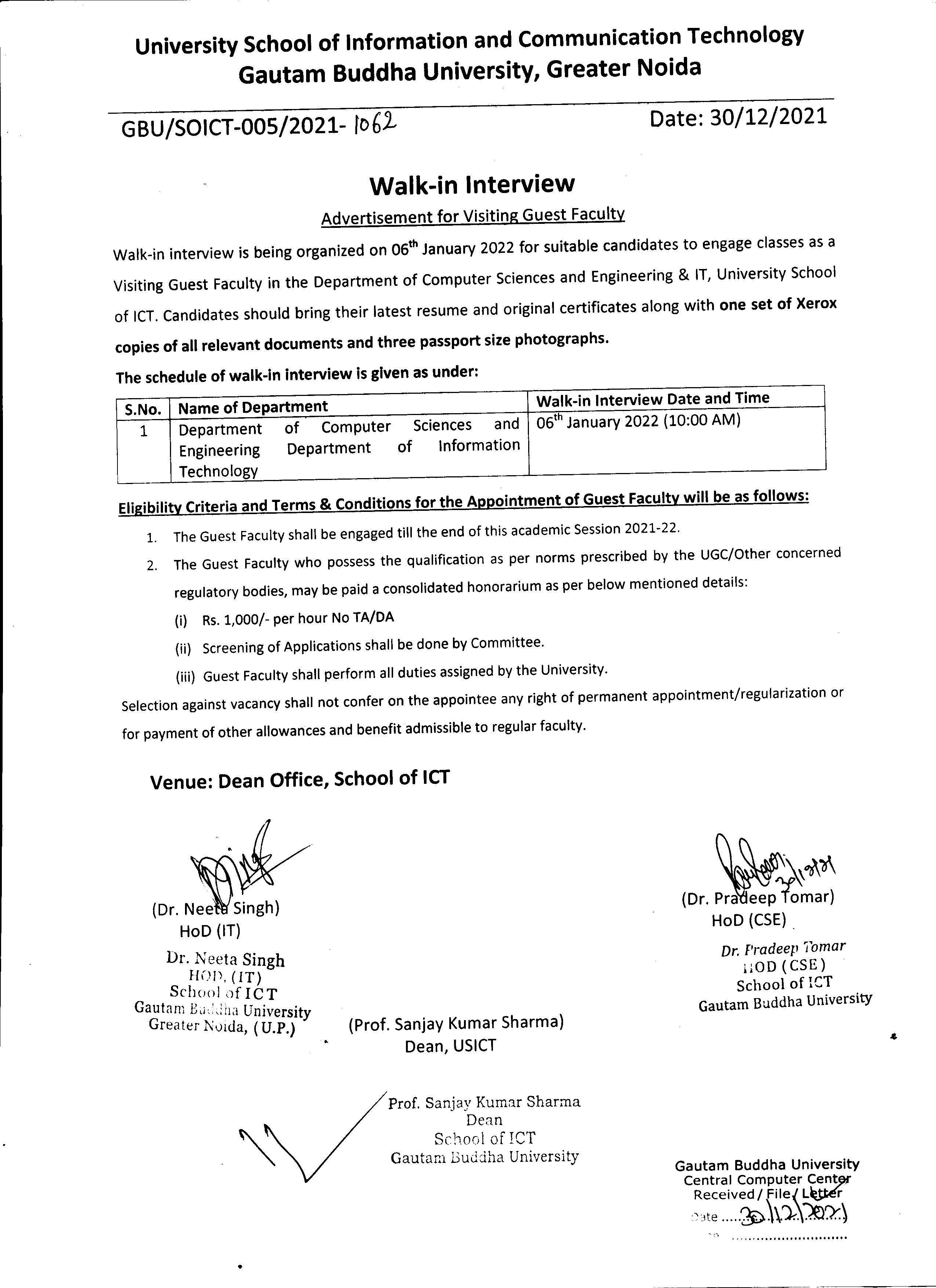 Walk-in-interview is being organized on 06" January 2022 for suitable candidates to engage classes as a Visiting Guest Faculty in the Department of Computer Sciences and Engineering & IT, University School of ICT. Candidates should bring their latest resume and original certificates along with one set of Xerox copies of all relevant documents and three passport size photographs. The schedule of walk-in-interview is given as under: