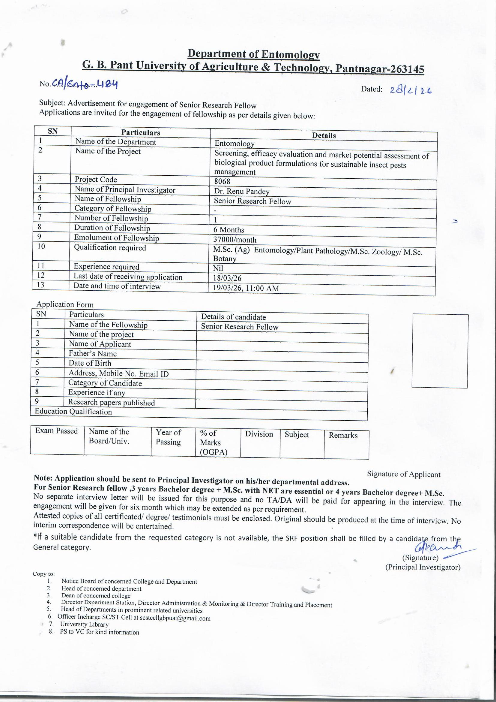 G.B. Pant University of Agriculture & Technology (GBPUAT), Pantnagar, has released a notification for the engagement of a Senior Research Fellow (SRF) under the Department of Entomology. This is an excellent opportunity for postgraduates in Agricultural Sciences or Zoology/Botany to work on a research project focused on sustainable insect pest management. This recruitment is strictly on a contract basis for a duration of 6 months (extendable) and does not involve a written competitive examination. Selection will be based on an Interview scheduled for March 19, 2026.