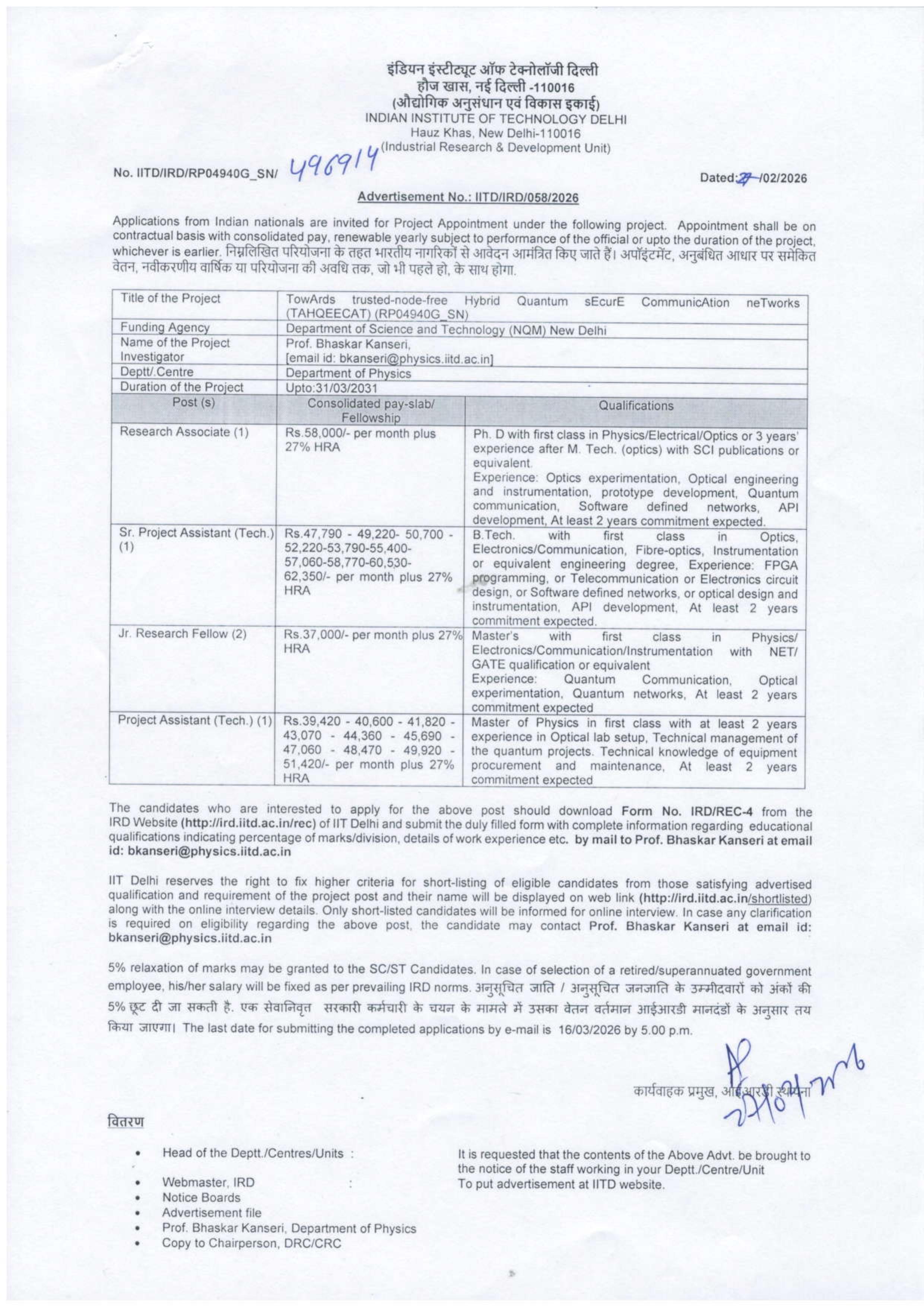 इंडियन इंस्टीट्यूट ऑफ टेक्नोलॉजी दिल्ली हौज खास, नई दिल्ली -110016 (औद्योगिक अनुसंधान एवं विकास इकाई) INDIAN INSTITUTE OF TECHNOLOGY DELHI Hauz Khas, New Delhi-110016 / आय Research & Development Unit) No. lITD/IRD/RP04940G_SN/ yd Dated.4-/02/2026 Advertisement No.: IITD/IRD/058/2026 Applications from Indian nationals are invited for Project Appointment under the following project. Appointment shall be on contractual basis with consolidated pay, renewable tees subject oe rformance of the official or upto the duration of the project, whichever is earlier. Pufefad uRatern के तहत भारतीय नागरिकों आमंत्रित किए जाते हैं। अपॉइंटमेंट, अनुबंधित आधार पर समेकित वेतन, नवीकरणीय वार्षिक या परियोजना की अवधि तक, जो भी पहले हो, के साथ होगा. Title of the Project TowArds _trusted-node-free Hybrid Quantum sEcurE CommunicAtion neTworks TAHQEECAT) (RP04940G_SN Funding Agen Department of Science and Technology (NQM) New Delhi Name of the Project Prof. Bhaskar Kanseri, Investigator email id: [email protected] Deptt/.Centre Department of Physics Duration of the Project Upto:31/03/2031 ie Shi ee ai | = 3 } een 4 20 ८7 4 0. ee Peat 1 a3 ee | Research Associate (1) Rs.58,000/- per month plus Ph. D with first class in Physics/Electrical/Optics or 3 years' 27% HRA experience after M. Tech. (optics) with SCI publications or equivalent Experience: Optics experimentation, Optical engineering and instrumentation, prototype development, Quantum communication, Software defined networks, API development, At least 2 years commitment expected. Sr. Project Assistant (Tech.)| Rs.47,790 - 49,220- 50,700 - | B.Tech. with first class in Optics, (1) 52,220-53,790-55,400- Electronics/Communication, Fibre-optics, Instrumentation 57 ,060-58,770-60,530- or equivalent engineering degree, Experience: FPGA 62,350/- per month plus 27% | programming, or Telecommunication or Electronics circuit HRA "| design, or Software defined networks, or optical design and instrumentation, AP! development, At least 2 years commitment expected. Jr. Research Fellow (2) Rs.37,000/- per month plus 27% Master's with first class in Physics/ HRA Electronics/Communication/Instrumentation with NET/ GATE qualification or equivalent Experience: Quantum Communication, Optical experimentation, Quantum networks, At least 2 years commitment expected Project Assistant (Tech.) (1)| Rs.39,420 - 40,600 - 41,820 - | Master of Physics in first class with at least 2 years 43,070 - 44,360 - 45,690 - | experience in Optical lab setup, Technical management of 47,060 - 48,470 - 49,920 - | the quantum projects. Technical knowledge of equipment 51,420/- per month plus 27% | procurement and maintenance, At least 2 years HRA commitment expected The candidates who are interested to apply for the above post should download Form No. IRD/REC-4 from the IRD Website (http://ird.iitd.ac.in/rec) of IIT Delhi and submit the duly filled form with complete information regarding educational qualifications indicating percentage of marks/division, details of work experience etc. by mail to Prof. Bhaskar Kanseri at email id: [email protected] IIT Dethi reserves the right to fix higher criteria for short-listing of eligible candidates from those Satisfying advertised qualification and requirement of the project post and their name will be displayed on web link (http://ird.iitd.ac.in/shortlisted) along with the online interview details. Only short-listed candidates will be informed for online interview. In case any clarification is required on eligibility regarding the above post, the candidate may contact Prof. Bhaskar Kanseri at email id: [email protected] 5% relaxation of marks may be granted to the SC/ST Candidates. In case of selection of a retired/superannuated government employee, his/her salary will be fixed as per prevailing IRD norms. 3eayfad sifa / srepyfea seronfea a sesfeant a aiet ar 5% छूट दी जा सकती है. एक सेवानिवृत्त सरकारी कर्मचारी के चयन के मामले में उसका वेतन वर्तमान आईआरडी मानदंडों के अनुसार तय fur Svs) The last date for submitting the completed applications by e-mail is 16/03/2026 by 5.00 p.m. ; कार्यवाहक प्रमुख, ey, वितरण ¢ Head of the Deptt./Centres/Units : It is requested that the contents of the Above Advt. be brought to न the notice of the staff working in your Deptt./Centre/Unit e Webmaster, IRD : To put advertisement at IITD website. ¢ Notice Boards e Advertisement file e Prof. Bhaskar Kanseri, Department of Physics e Copy to Chairperson, DRC/CRC