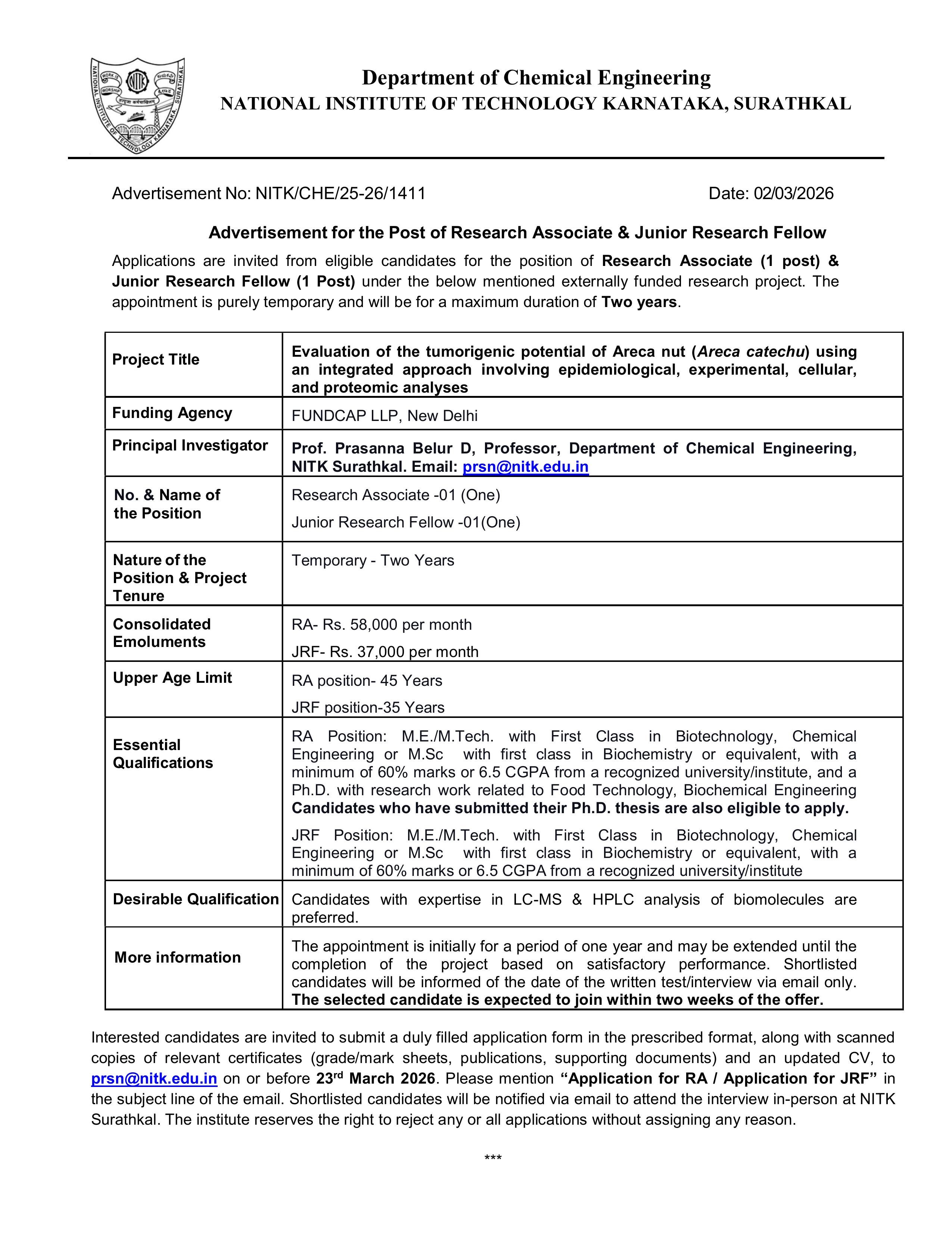 The Department of Chemical Engineering at the National Institute of Technology Karnataka, Surathkal (NITK) has released an advertisement for the recruitment of Research Associate (01 Post) and Junior Research Fellow (01 Post). These positions are for a temporary tenure of two years under an externally funded research project titled "Evaluation of the tumorigenic potential of Areca nut (Areca catechu) using an integrated approach involving epidemiological, experimental, cellular, and proteomic analyses", funded by FUNDCAP LLP, New Delhi. This is a direct recruitment based on merit and interview, offering an excellent opportunity for candidates with a strong background in Biotechnology, Chemical Engineering, or Biochemistry to contribute to cutting-edge research. The appointment is purely temporary.