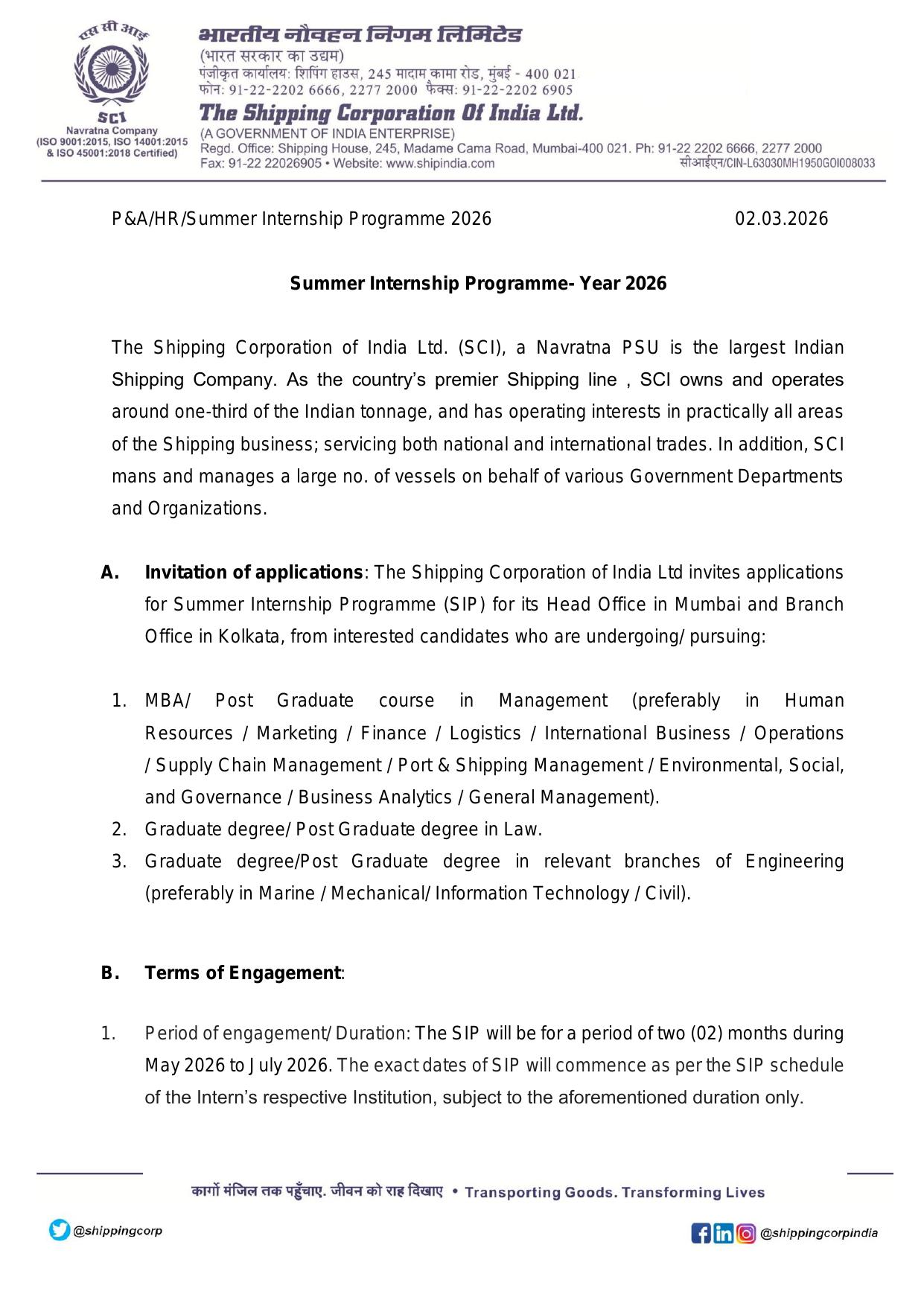 The Shipping Corporation of India Ltd. (SCI), a premier Navratna PSU, invites applications for its Summer Internship Programme (SIP) 2026. This is a prestigious opportunity for students pursuing Management, Law, or Engineering degrees to gain hands-on experience in India's largest shipping company. The internship will be conducted at the Head Office in Mumbai and Branch Office in Kolkata.