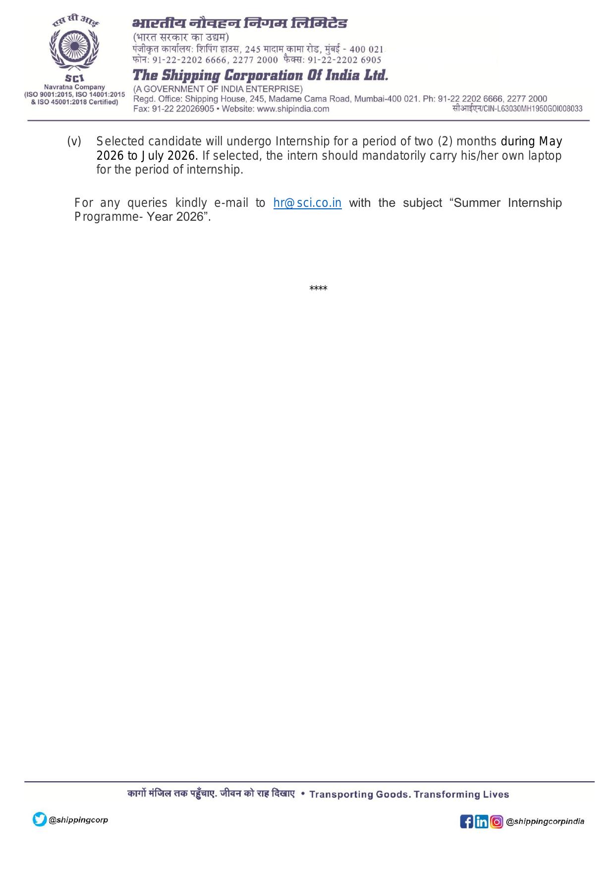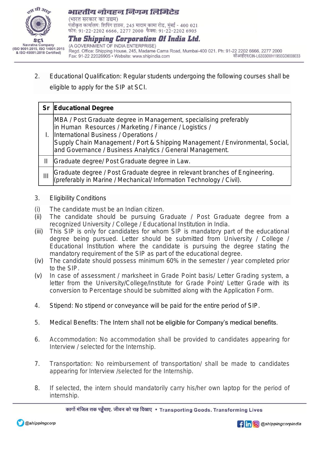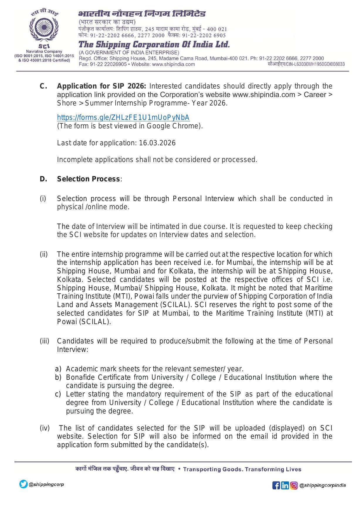 Note: Selected candidates may be posted at Maritime Training Institute (MTI), Powai (under SCILAL) for Mumbai internships.