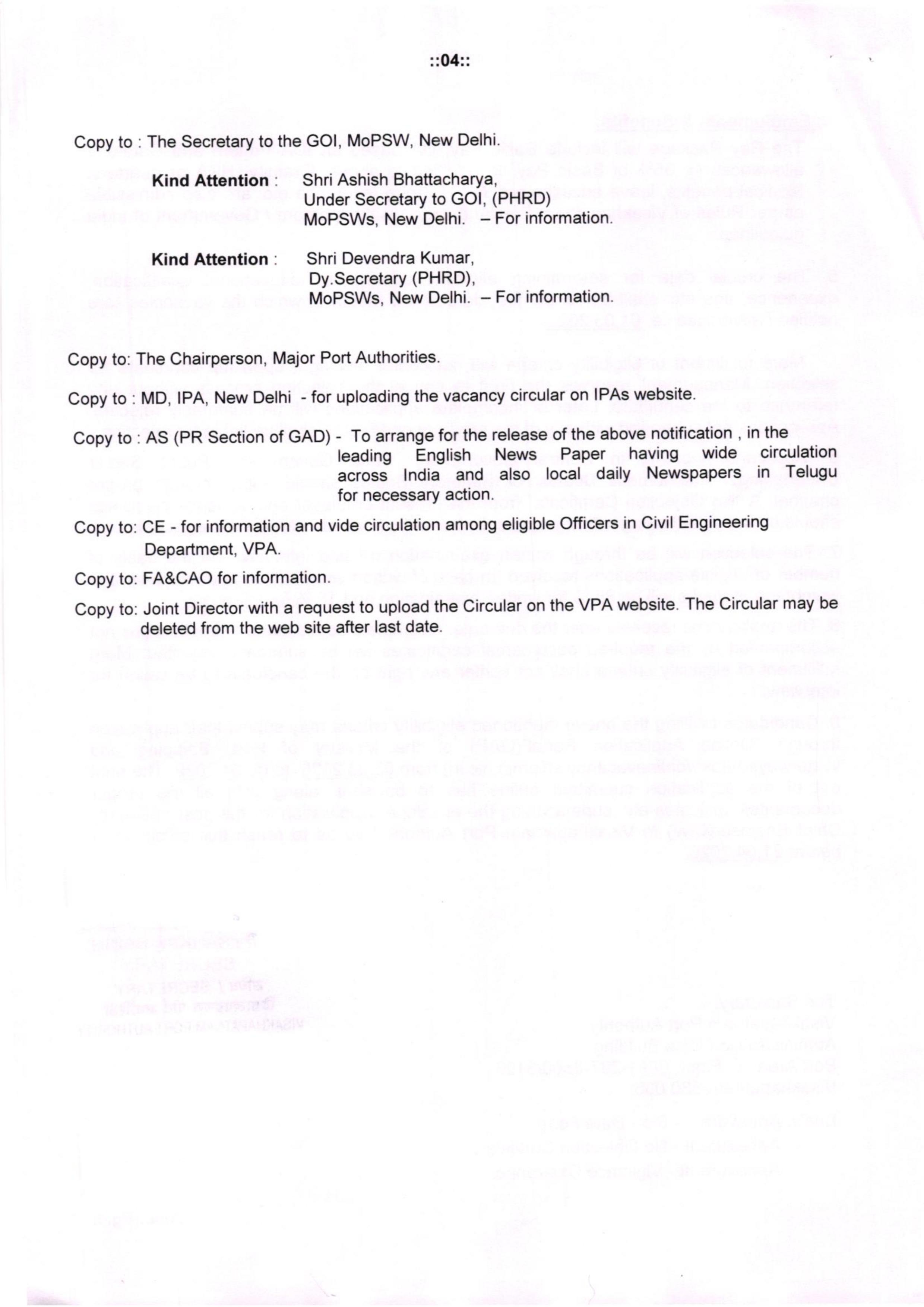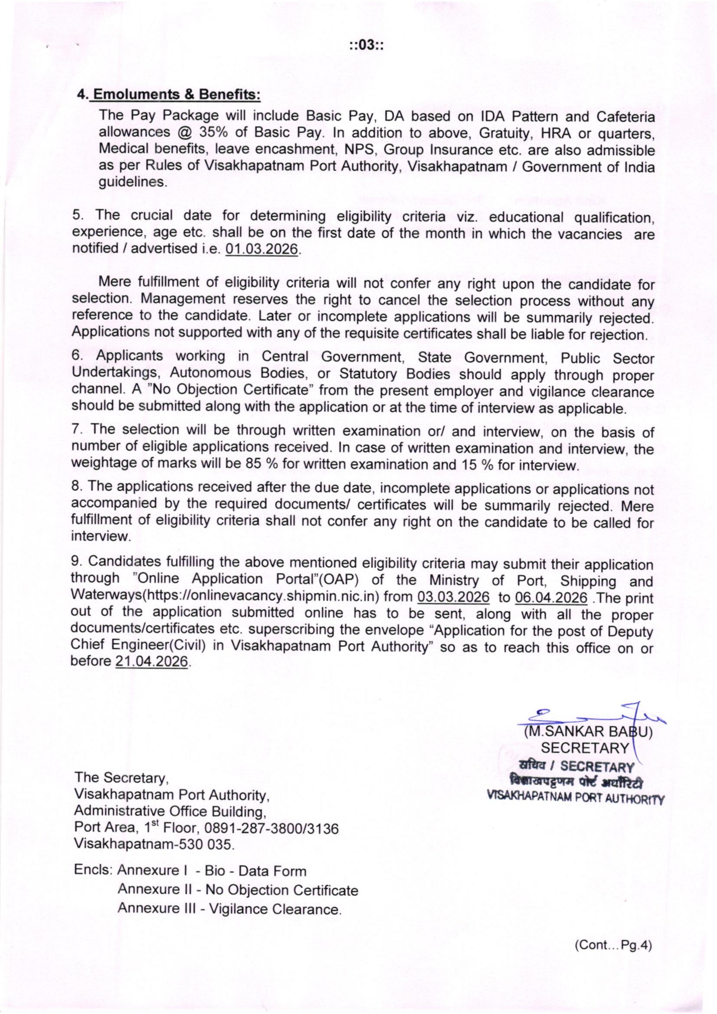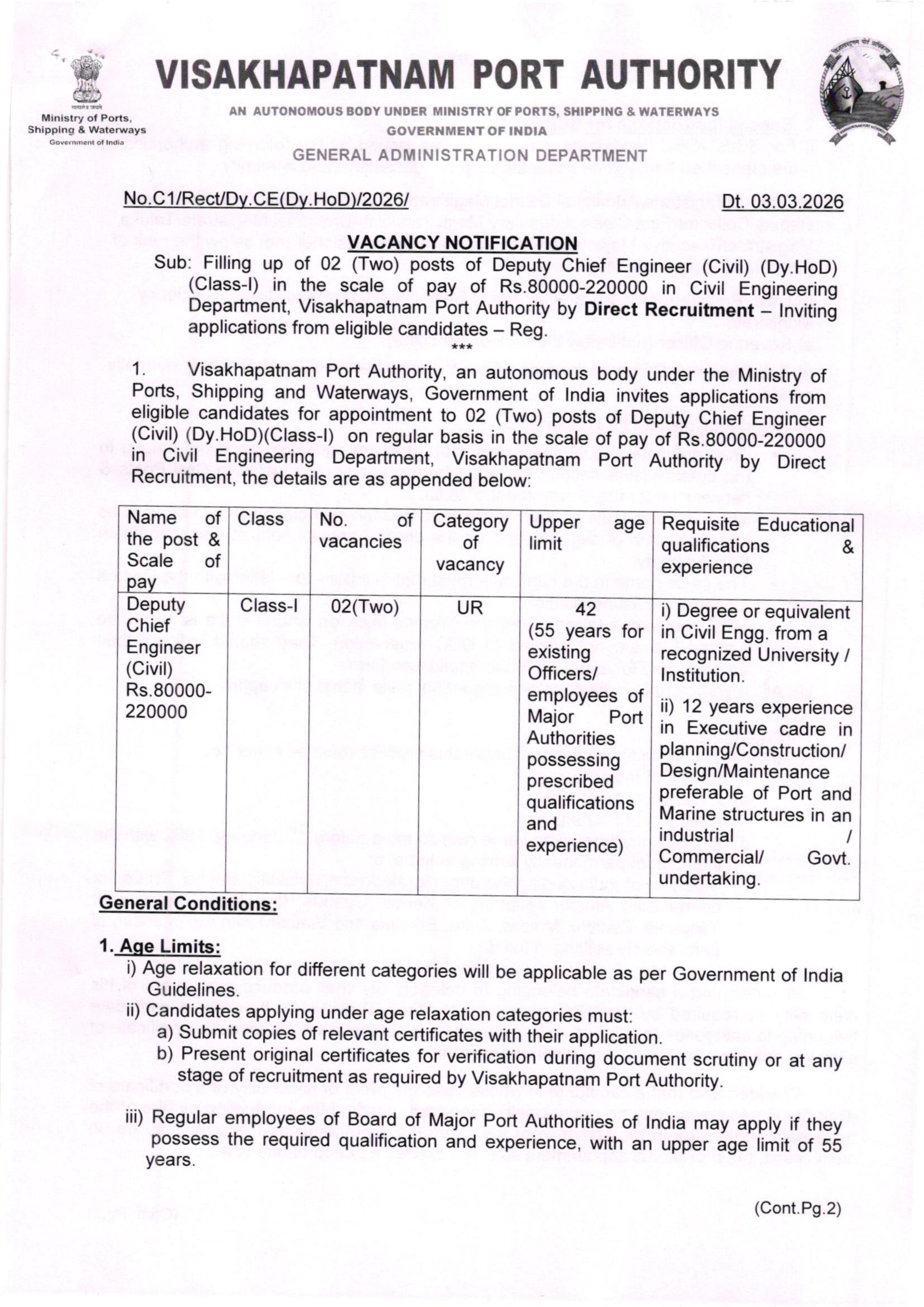 es oe AN AUTONOMOUS BODY UNDER MINISTRY OF PORTS, SHIPPING & WATERWAYS * VISAKHAPATNAM PORT AUTHORITY etapa k Riceies GOVERNMENT OF INDIA Os ae GENERAL ADMINISTRATION DEPARTMENT No.C1/Rect/Dy.CE(Dy.HoD)/2026/ Dt. 03.03.2026 VACANCY NOTIFICATION Sub: Filling up of 02 (Two) posts of Deputy Chief Engineer (Civil) (Dy.HoD) (Class-l) in the scale of pay of Rs.80000-220000 in Civil Engineering Department, Visakhapatnam Port Authority by Direct Recruitment — Inviting applications from eligible candidates — Reg. 7 Visakhapatnam Port Authority, an autonomous body under the Ministry of Ports, Shipping and Waterways, Government of India invites applications from eligible candidates for appointment to 02 (Two) posts of Deputy Chief Engineer (Civil) (Dy.HoD)(Class-l) on regular basis in the scale of pay of Rs.80000-220000 in Civil Engineering Department, Visakhapatnam Port Authority by Direct Recruitment, the details are as appended below: Name of | Class No. of | Category | Upper age! Requisite Educational the post & vacancies of limit qualifications & Scale __ of vacancy experience pa Deputy Class-| | 02(Two) UR 42 i) Degree or equivalent Chief (55 years for | in Civil Engg. from a Engineer existing recognized University / (Civil) Officers/ Institution. aan fone es 1) 12 years experience in Executive cadre in Authorities planning/Construction/ ee Design/Maintenance oe ibed preferable of Port and ae HICRUONS Marine structures in an ५ industrial / SXPONSHCE) Commercial/ Govt. undertaking. General Conditions: 1. Age Limits: i) Age relaxation for different categories will be applicable as per Government of India Guidelines. ii) Candidates applying under age relaxation categories must: a) Submit copies of relevant certificates with their application. b) Present original certificates for verification during document scrutiny or at any Stage of recruitment as required by Visakhapatnam Port Authority. iii) Regular employees of Board of Major Port Authorities of India may apply if they possess the required qualification and experience, with an upper age limit of 55 years. (Cont.Pg.2) 62: 2. Special instructions for SC/ST/OBC: i) For SC/ST/OBC candidates, only certificates issued by the following authorities in the prescribed form will be accepted as proof of caste/tribe/community: a) District Magistrate/Additional District Magistrate/Collector/Deputy Commissioner/ Deputy Collector/First Class stipendiary Magistrate/Sub-Divisional Magistrate/Taluka Magistrate/Executive Magistrate/Extra Assistant Commissioner (not below the rank of First Class Stipendiary Magistrate). b) Chief Presidency Magistrate/Additional Chief Presidency Magistrate/Presidency Magistrate c) Revenue Officer (not below the rank of Tehsildar). d) Sub-Divisional Officer of the area where the candidate and / or their family normally reside. ii) Important Note for OBC candidates: * The certificate should specifically state that the candidate does not belong to the creamy layer section excluded from reservation benefits in Civil Posts & services under the Government of India. * The OBC certificate containing the Non-creamy layer clause should be valid as of crucial date of eligibility and on the date of appointment at Visakhapatnam Port Authority. * The caste name in the certificate must match letter - for -letter with the Central Government list/notification. * OBC candidates falling under the Creamy layer on whose caste is not in the Central List are not entitled to OBC reservation. They should indicate their category as General (UR) in the application form. iii) All Government of India directives regarding caste status shall apply. 3.Nationality: A candidate applying for recruitment under this process must be either be: a) Citizen of India, or b) A subject of Nepal, or c) A subject of Bhutan, or d) A Tibetan refugee who came over to India before 1° January, 1962 with the intention of permanently settling in India, or e) a person of India origin who has migrated from Pakistan, Burma, Sri Lanka or the East African countries of Kenya, Uganda, the United Republic of Tanzania, Zambia, Malawi, Zaire, Ethiopia and Vietnam with the intention of permanently settling in India. Provided that a candidate belonging to category (a) shall produce such proof of his nationality as required by the VPA, from time to time. Provided further that a candidate belonging to categories (b), (c), (d) and (e) shall be a person in whose favour a certificate of eligibility has been issued by the Government of India. Provided also that a candidate in whose case the proof of nationality or a certificate of eligibility is necessary may be provisionally appointed, pending the production by him of the necessary certificates in his favour from the Central Government, as the case may be. In such cases, the provisional appointment shall not exceed a period of one year. (Cont..Pg.3) :703:: 4. Emoluments & Benefits: The Pay Package will include Basic Pay, DA based on IDA Pattern and Cafeteria allowances @ 35% of Basic Pay. In addition to above, Gratuity, HRA or quarters, Medical benefits, leave encashment, NPS, Group Insurance etc. are also admissible as per Rules of Visakhapatnam Port Authority, Visakhapatnam / Government of India guidelines. 5. The crucial date for determining eligibility criteria viz. educational qualification, experience, age etc. shall be on the first date of the month in which the vacancies are notified / advertised i.e. 01.03.2026. Mere fulfillment of eligibility criteria will not confer any right upon the candidate for selection. Management reserves the right to cancel the selection process without any reference to the candidate. Later or incomplete applications will be summarily rejected. Applications not supported with any of the requisite certificates shall be liable for rejection. 6. Applicants working in Central Government, State Government, Public Sector Undertakings, Autonomous Bodies, or Statutory Bodies should apply through proper channel. A