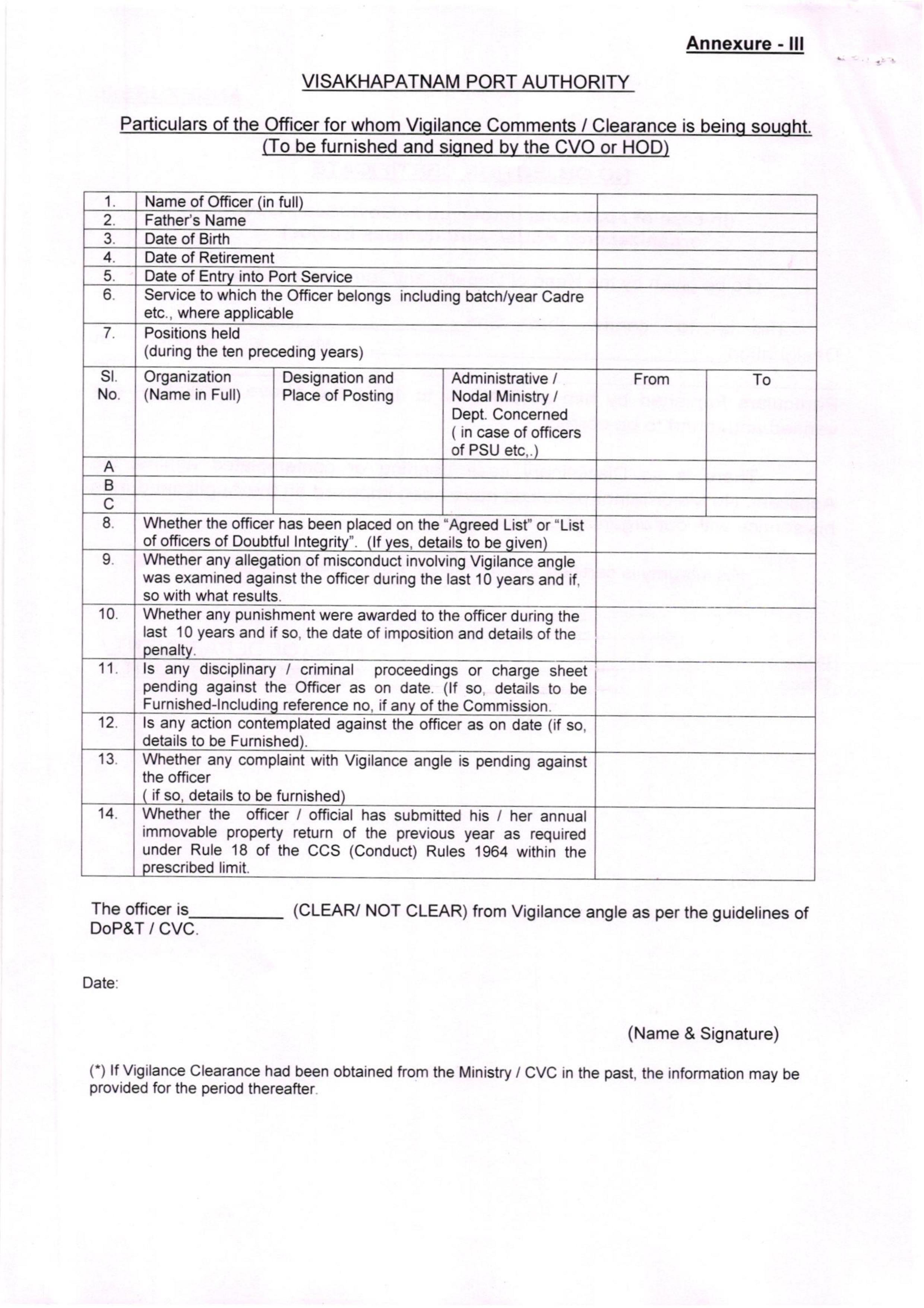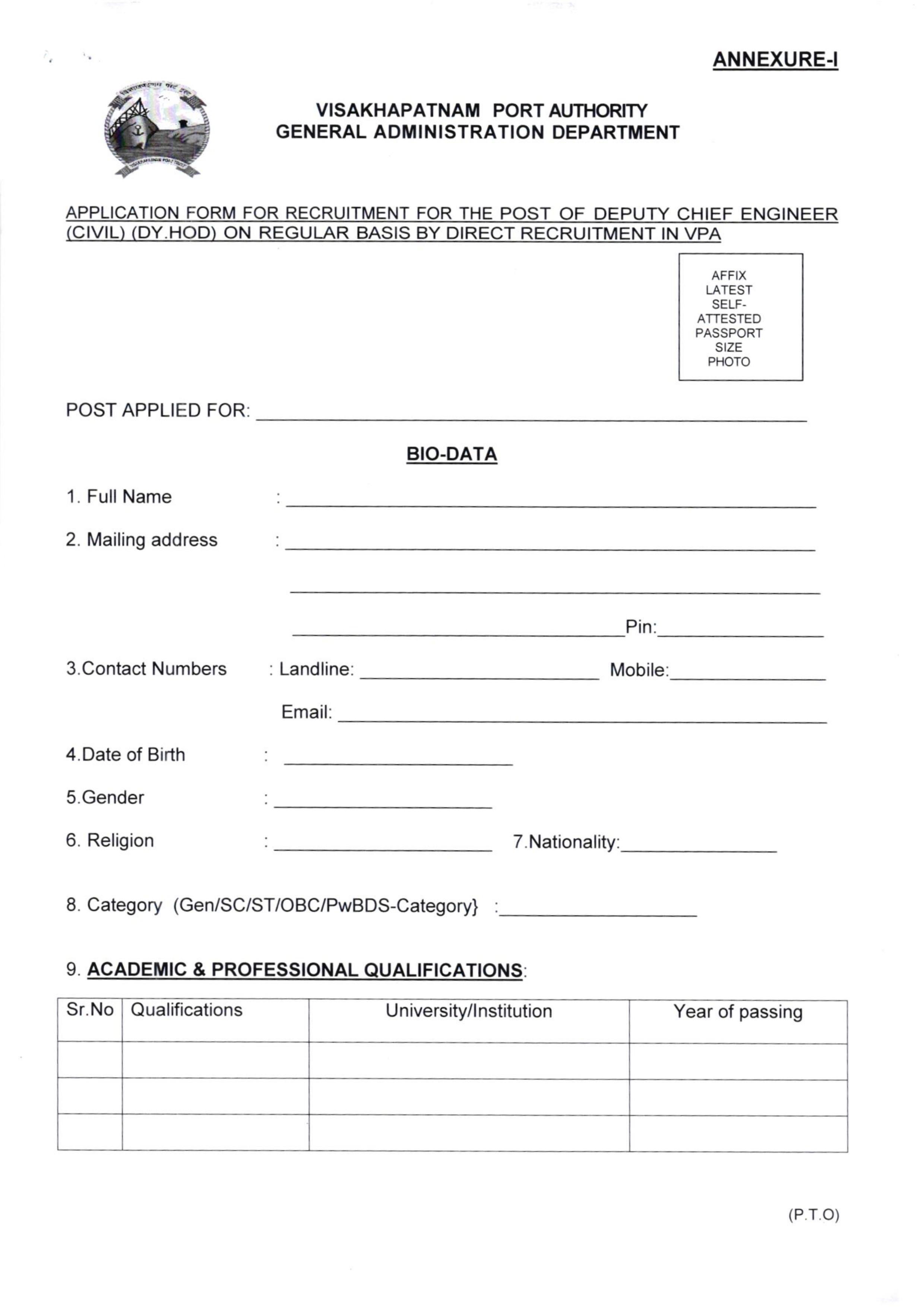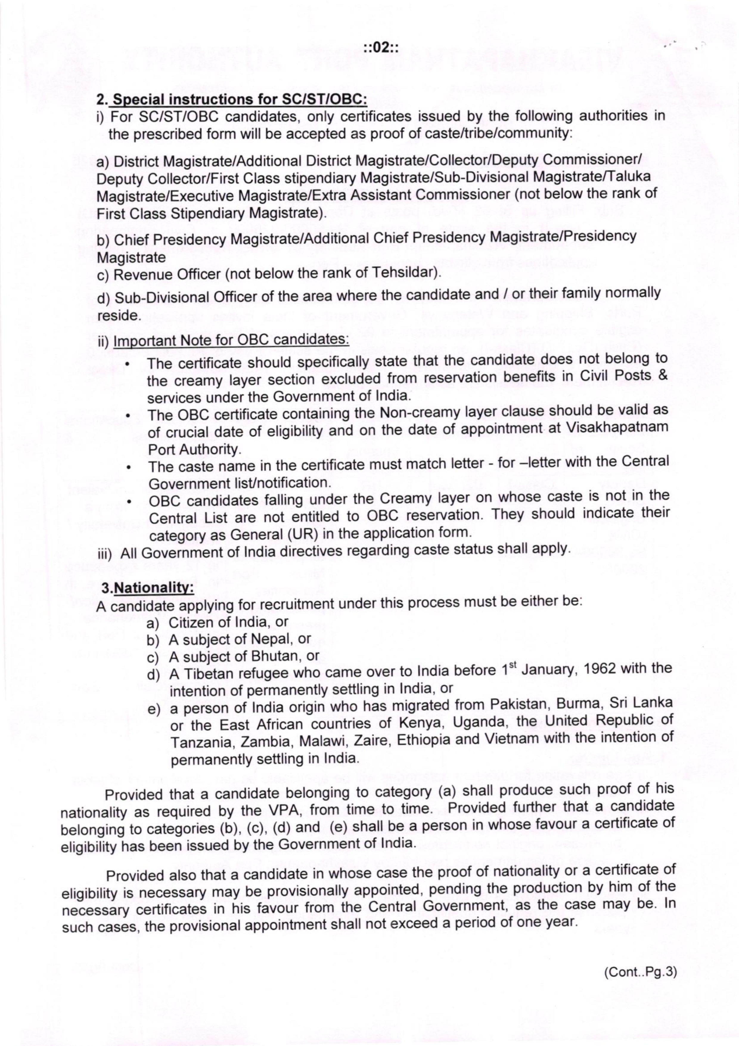 es oe AN AUTONOMOUS BODY UNDER MINISTRY OF PORTS, SHIPPING & WATERWAYS * VISAKHAPATNAM PORT AUTHORITY etapa k Riceies GOVERNMENT OF INDIA Os ae GENERAL ADMINISTRATION DEPARTMENT No.C1/Rect/Dy.CE(Dy.HoD)/2026/ Dt. 03.03.2026 VACANCY NOTIFICATION Sub: Filling up of 02 (Two) posts of Deputy Chief Engineer (Civil) (Dy.HoD) (Class-l) in the scale of pay of Rs.80000-220000 in Civil Engineering Department, Visakhapatnam Port Authority by Direct Recruitment — Inviting applications from eligible candidates — Reg. 7 Visakhapatnam Port Authority, an autonomous body under the Ministry of Ports, Shipping and Waterways, Government of India invites applications from eligible candidates for appointment to 02 (Two) posts of Deputy Chief Engineer (Civil) (Dy.HoD)(Class-l) on regular basis in the scale of pay of Rs.80000-220000 in Civil Engineering Department, Visakhapatnam Port Authority by Direct Recruitment, the details are as appended below: Name of | Class No. of | Category | Upper age! Requisite Educational the post & vacancies of limit qualifications & Scale __ of vacancy experience pa Deputy Class-| | 02(Two) UR 42 i) Degree or equivalent Chief (55 years for | in Civil Engg. from a Engineer existing recognized University / (Civil) Officers/ Institution. aan fone es 1) 12 years experience in Executive cadre in Authorities planning/Construction/ ee Design/Maintenance oe ibed preferable of Port and ae HICRUONS Marine structures in an ५ industrial / SXPONSHCE) Commercial/ Govt. undertaking. General Conditions: 1. Age Limits: i) Age relaxation for different categories will be applicable as per Government of India Guidelines. ii) Candidates applying under age relaxation categories must: a) Submit copies of relevant certificates with their application. b) Present original certificates for verification during document scrutiny or at any Stage of recruitment as required by Visakhapatnam Port Authority. iii) Regular employees of Board of Major Port Authorities of India may apply if they possess the required qualification and experience, with an upper age limit of 55 years. (Cont.Pg.2) 62: 2. Special instructions for SC/ST/OBC: i) For SC/ST/OBC candidates, only certificates issued by the following authorities in the prescribed form will be accepted as proof of caste/tribe/community: a) District Magistrate/Additional District Magistrate/Collector/Deputy Commissioner/ Deputy Collector/First Class stipendiary Magistrate/Sub-Divisional Magistrate/Taluka Magistrate/Executive Magistrate/Extra Assistant Commissioner (not below the rank of First Class Stipendiary Magistrate). b) Chief Presidency Magistrate/Additional Chief Presidency Magistrate/Presidency Magistrate c) Revenue Officer (not below the rank of Tehsildar). d) Sub-Divisional Officer of the area where the candidate and / or their family normally reside. ii) Important Note for OBC candidates: * The certificate should specifically state that the candidate does not belong to the creamy layer section excluded from reservation benefits in Civil Posts & services under the Government of India. * The OBC certificate containing the Non-creamy layer clause should be valid as of crucial date of eligibility and on the date of appointment at Visakhapatnam Port Authority. * The caste name in the certificate must match letter - for -letter with the Central Government list/notification. * OBC candidates falling under the Creamy layer on whose caste is not in the Central List are not entitled to OBC reservation. They should indicate their category as General (UR) in the application form. iii) All Government of India directives regarding caste status shall apply. 3.Nationality: A candidate applying for recruitment under this process must be either be: a) Citizen of India, or b) A subject of Nepal, or c) A subject of Bhutan, or d) A Tibetan refugee who came over to India before 1° January, 1962 with the intention of permanently settling in India, or e) a person of India origin who has migrated from Pakistan, Burma, Sri Lanka or the East African countries of Kenya, Uganda, the United Republic of Tanzania, Zambia, Malawi, Zaire, Ethiopia and Vietnam with the intention of permanently settling in India. Provided that a candidate belonging to category (a) shall produce such proof of his nationality as required by the VPA, from time to time. Provided further that a candidate belonging to categories (b), (c), (d) and (e) shall be a person in whose favour a certificate of eligibility has been issued by the Government of India. Provided also that a candidate in whose case the proof of nationality or a certificate of eligibility is necessary may be provisionally appointed, pending the production by him of the necessary certificates in his favour from the Central Government, as the case may be. In such cases, the provisional appointment shall not exceed a period of one year. (Cont..Pg.3) :703:: 4. Emoluments & Benefits: The Pay Package will include Basic Pay, DA based on IDA Pattern and Cafeteria allowances @ 35% of Basic Pay. In addition to above, Gratuity, HRA or quarters, Medical benefits, leave encashment, NPS, Group Insurance etc. are also admissible as per Rules of Visakhapatnam Port Authority, Visakhapatnam / Government of India guidelines. 5. The crucial date for determining eligibility criteria viz. educational qualification, experience, age etc. shall be on the first date of the month in which the vacancies are notified / advertised i.e. 01.03.2026. Mere fulfillment of eligibility criteria will not confer any right upon the candidate for selection. Management reserves the right to cancel the selection process without any reference to the candidate. Later or incomplete applications will be summarily rejected. Applications not supported with any of the requisite certificates shall be liable for rejection. 6. Applicants working in Central Government, State Government, Public Sector Undertakings, Autonomous Bodies, or Statutory Bodies should apply through proper channel. A